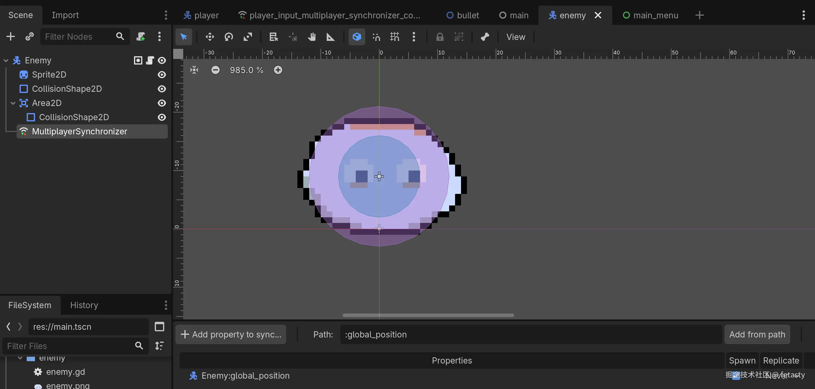 新增的Area2D用于处理子弹检测(紫色碰撞体), 最后的MultiplayerSynchronizer用于同步敌人的初始化位置