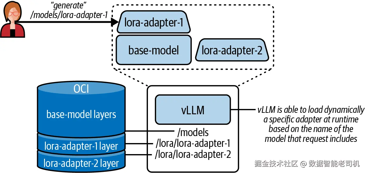 多个 LoRA adapter 甚至可以共享同一个 base model deployment,从而降低显存占用,并支持根据请求路由动态选择 adapter。
