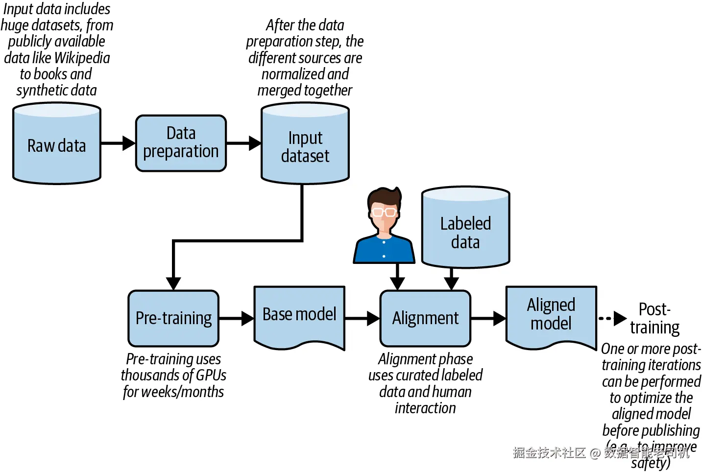 而模型定制 ,也就是通常所说的 post-training(后训练) ,就是发生在一个已经完成对齐的模型之上。图 6-1 展示了这一创建流水线的高层结构。