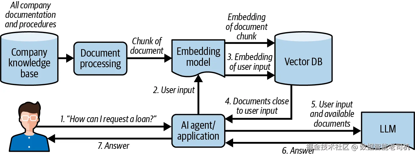 图 6-2 展示了一个 RAG 流水线的高层表示。关于 RAG 的实现模式与最佳实践,详见"Retrieval-Augmented Generation"。