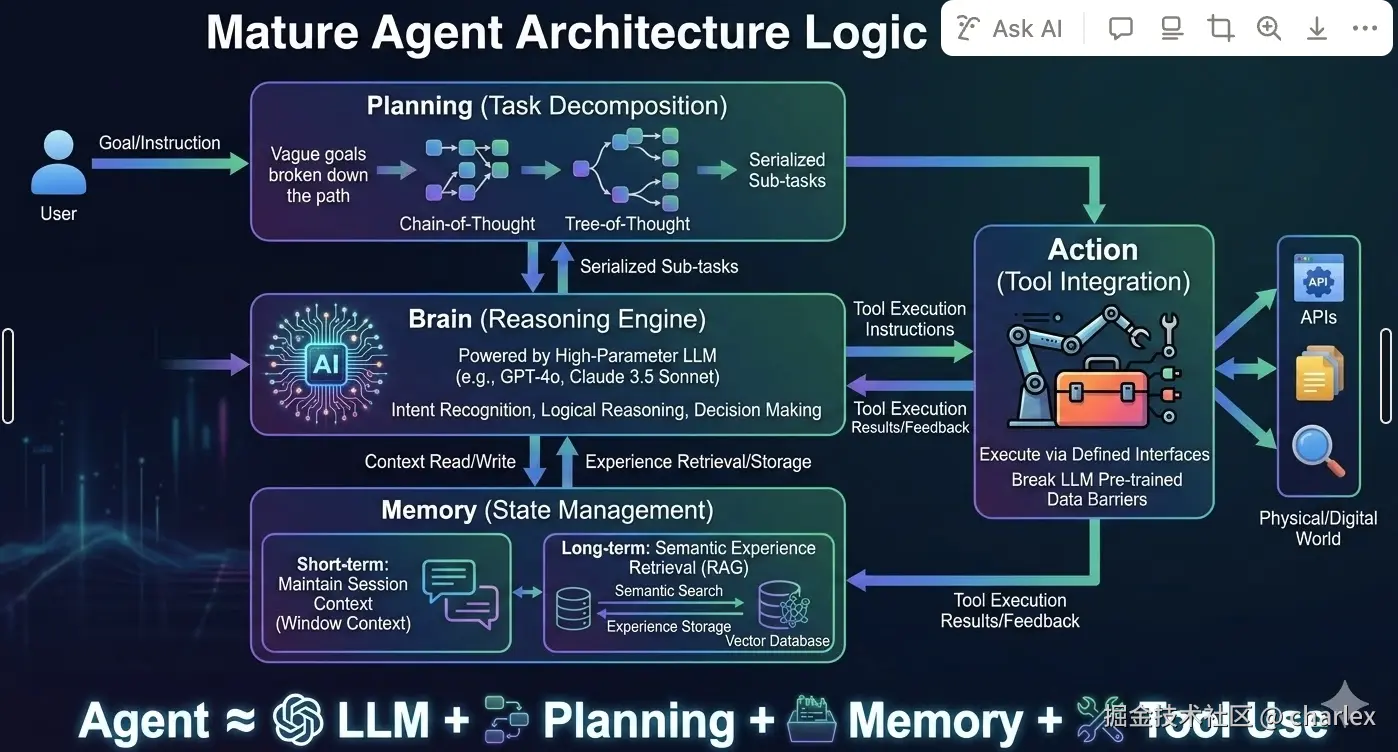 Brain (Reasoning Engine): 由高参数量 LLM(如 GPT-5.3, Claude 3.5 Sonnet)驱动,负责意图识别、逻辑推理与决策。