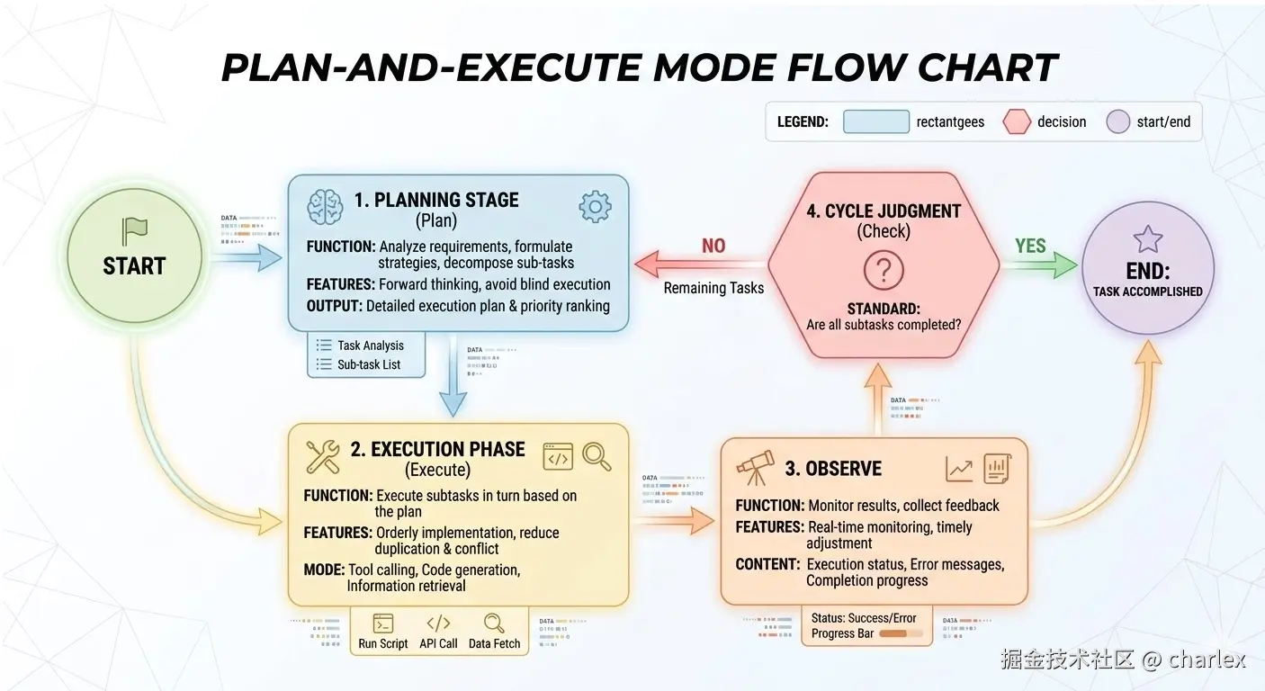 因此,Plan-and-Execute 往往把'推理'集中在规划阶段,把'执行'交给更稳定的执行器,并用状态来保证过程可追踪。