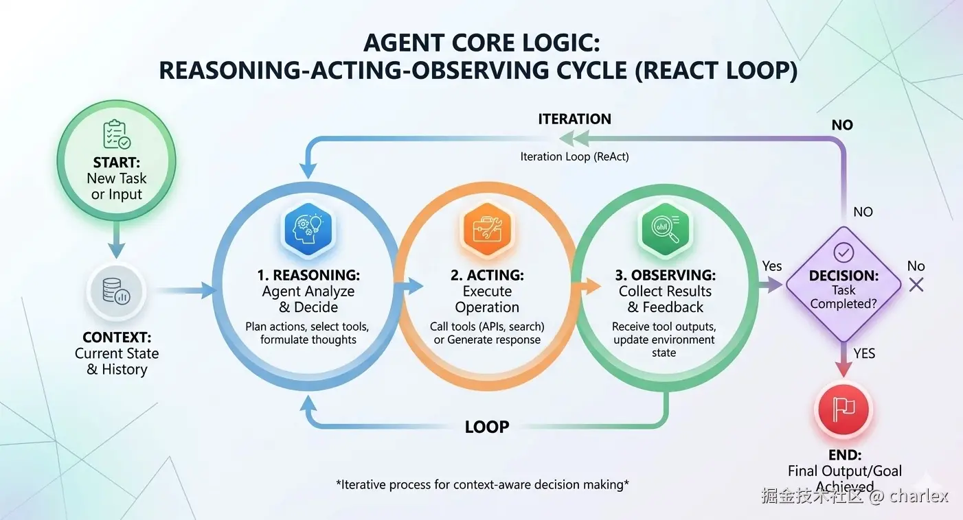 Agent 的核心运行逻辑通常是一个循环执行的推理-行动-观察流程(ReAct Loop)。