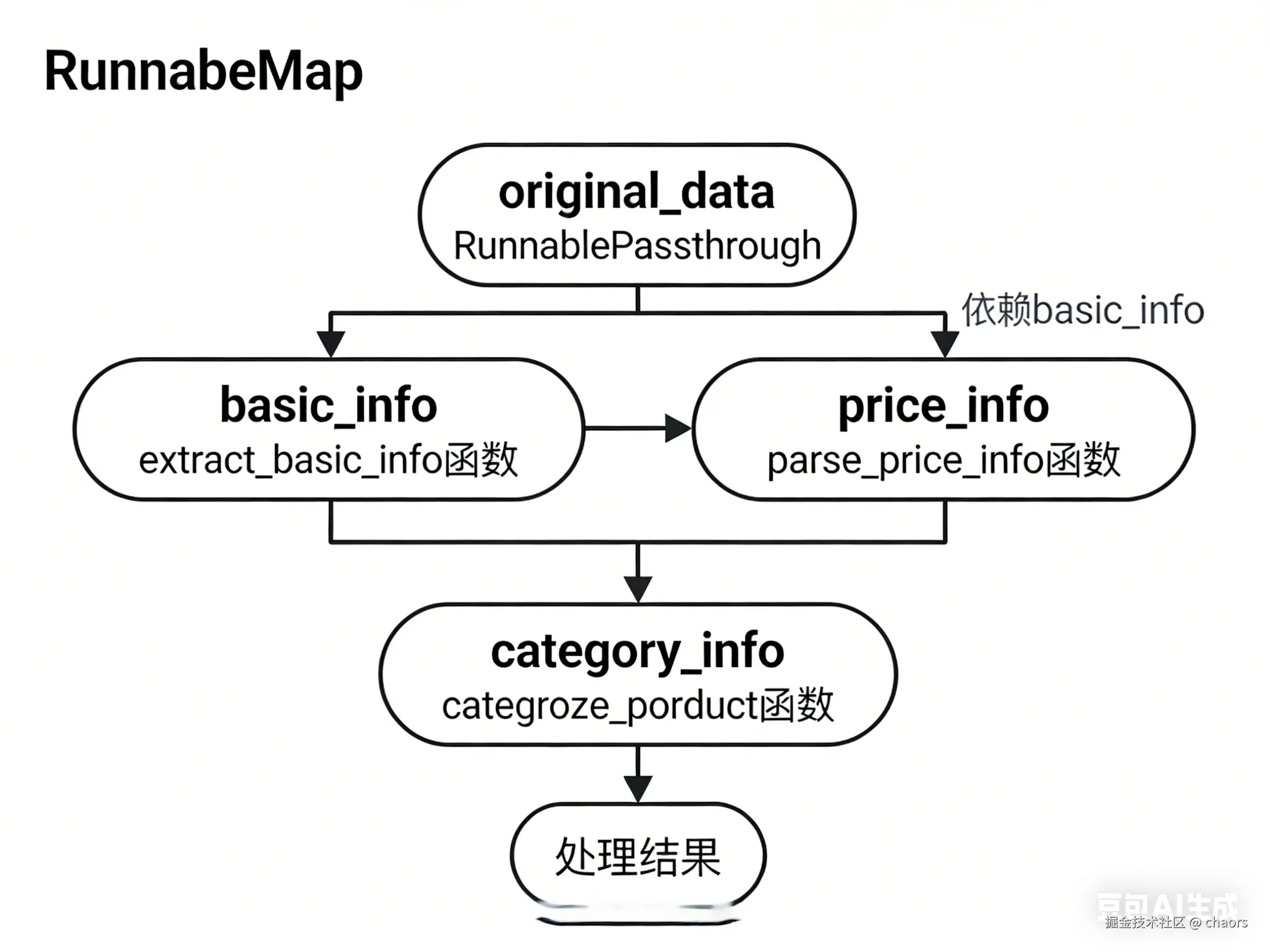 | RunnableMap | 数据转换模式,对输入进行结构化转换,输出单个字典 | 数据清洗、格式标准化、字段提取与映射 | 1. 数据预处理 2. API响应格式化 3. 特征工程 4. 输入输出格式适配 | 1. 常与RunnableLambda混淆 2. 输出必须是字典 3. 是顺序执行,非并行 | 顺序执行,总耗时=各转换步骤之和 | 常用于链的开头(数据准备)或结尾(结果格式化) |
