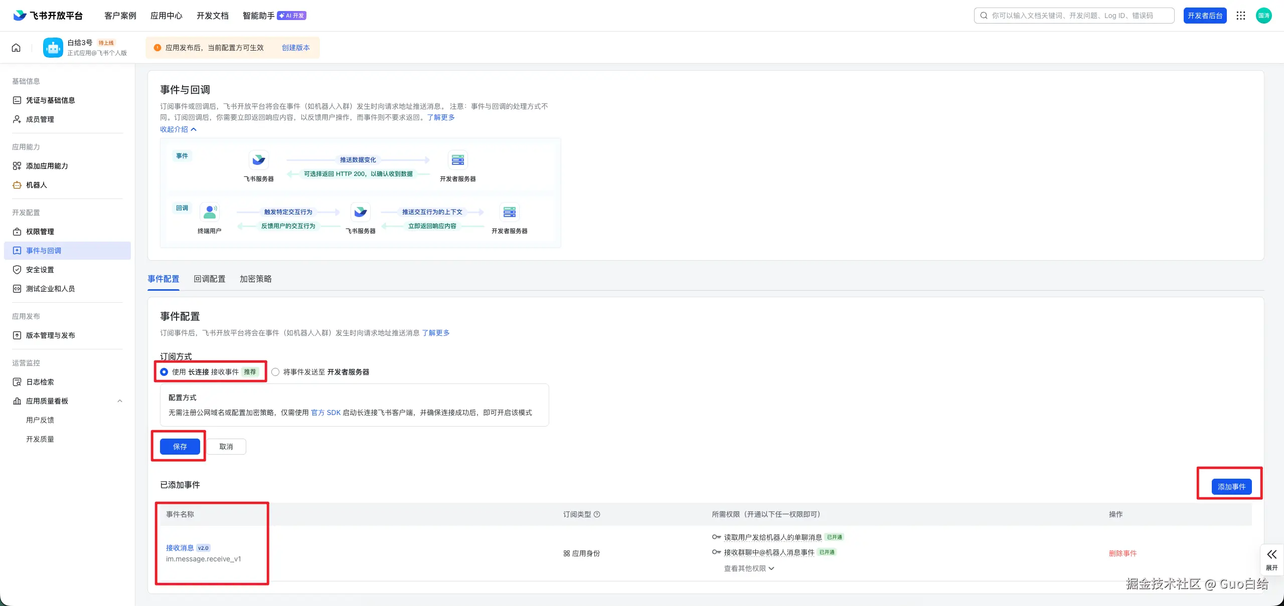 接下来是添加事件与回调,配置了这个机器人才会有与你沟通对话的能力,需要讲机器人的ID与Secret配置进openclaw里。