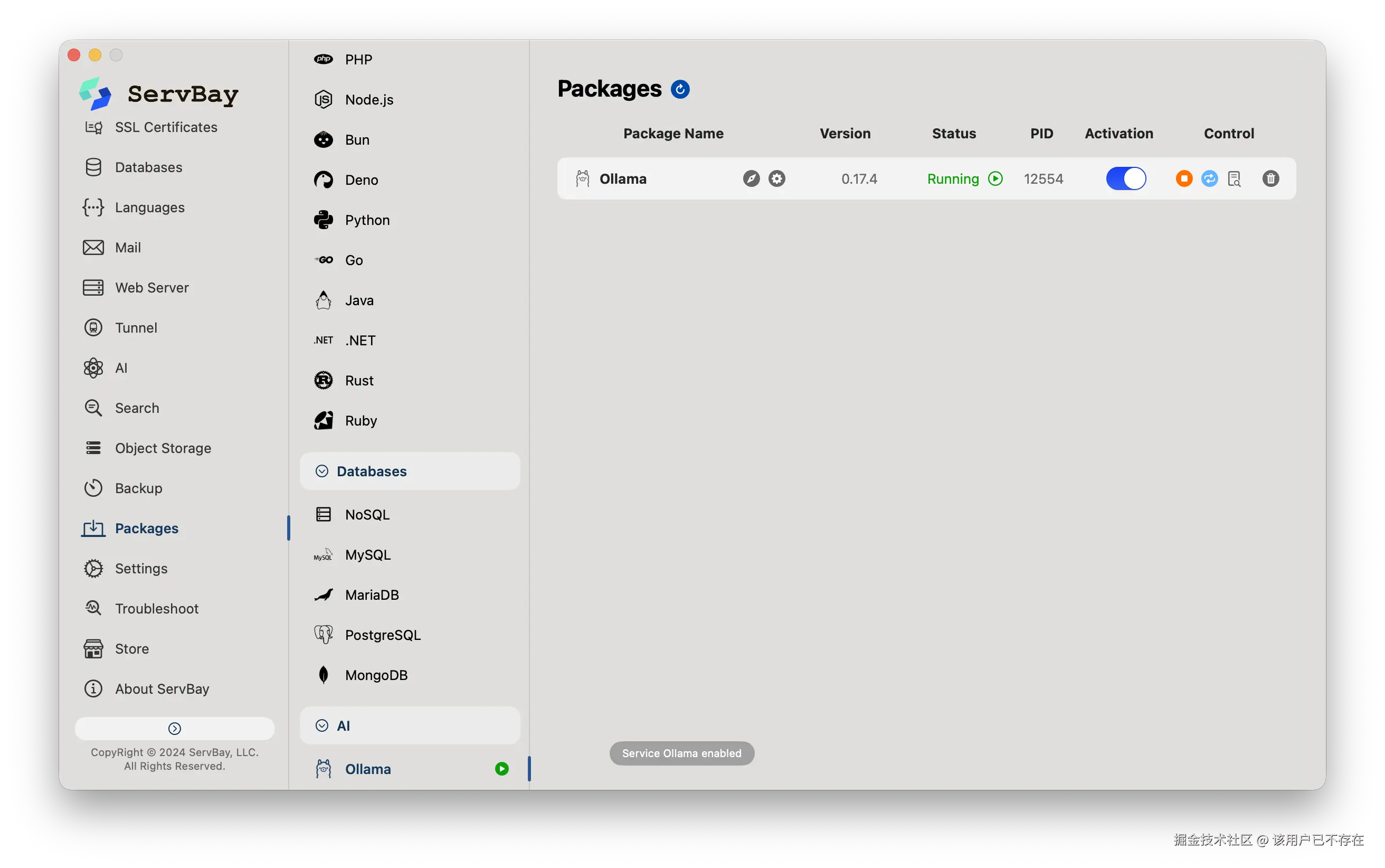 还是通过 ServBay,可以一键下载并安装Ollama。