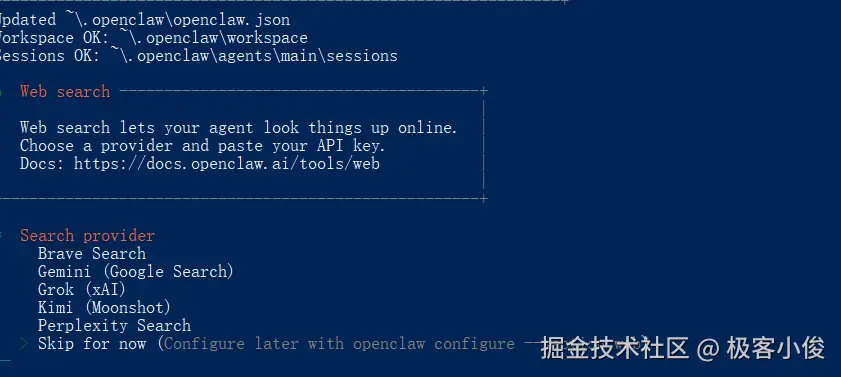 这里用同样方向键选中Skip for now,按回车 先跳过配置,后续用命令再填飞书API