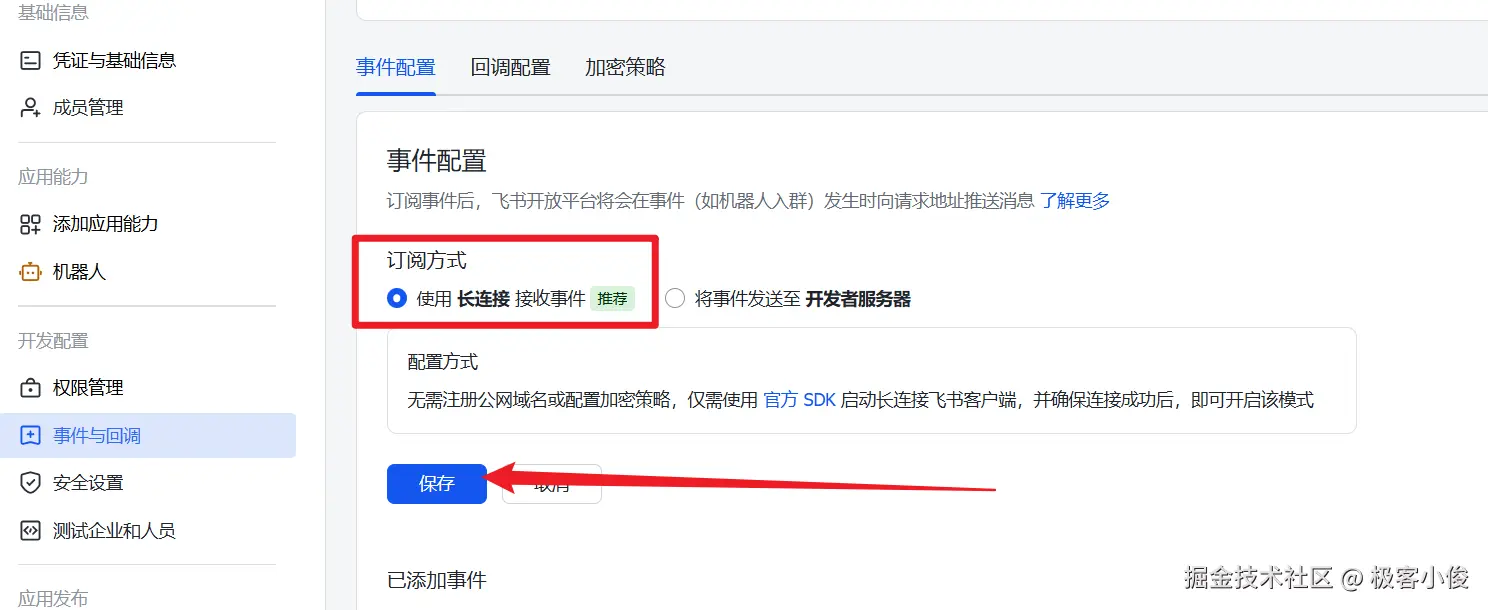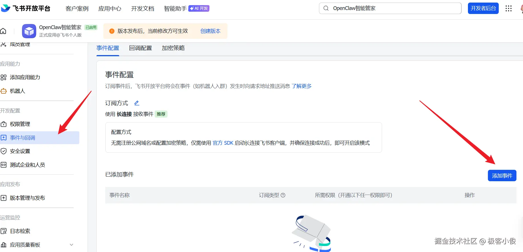 首先打开飞书后台管理,来到事件与回调, 点击添加事件