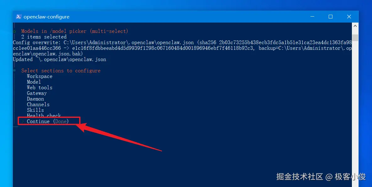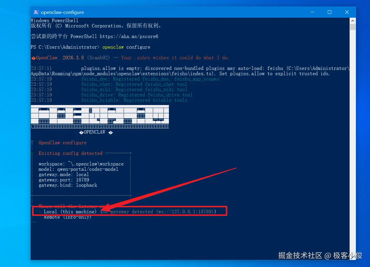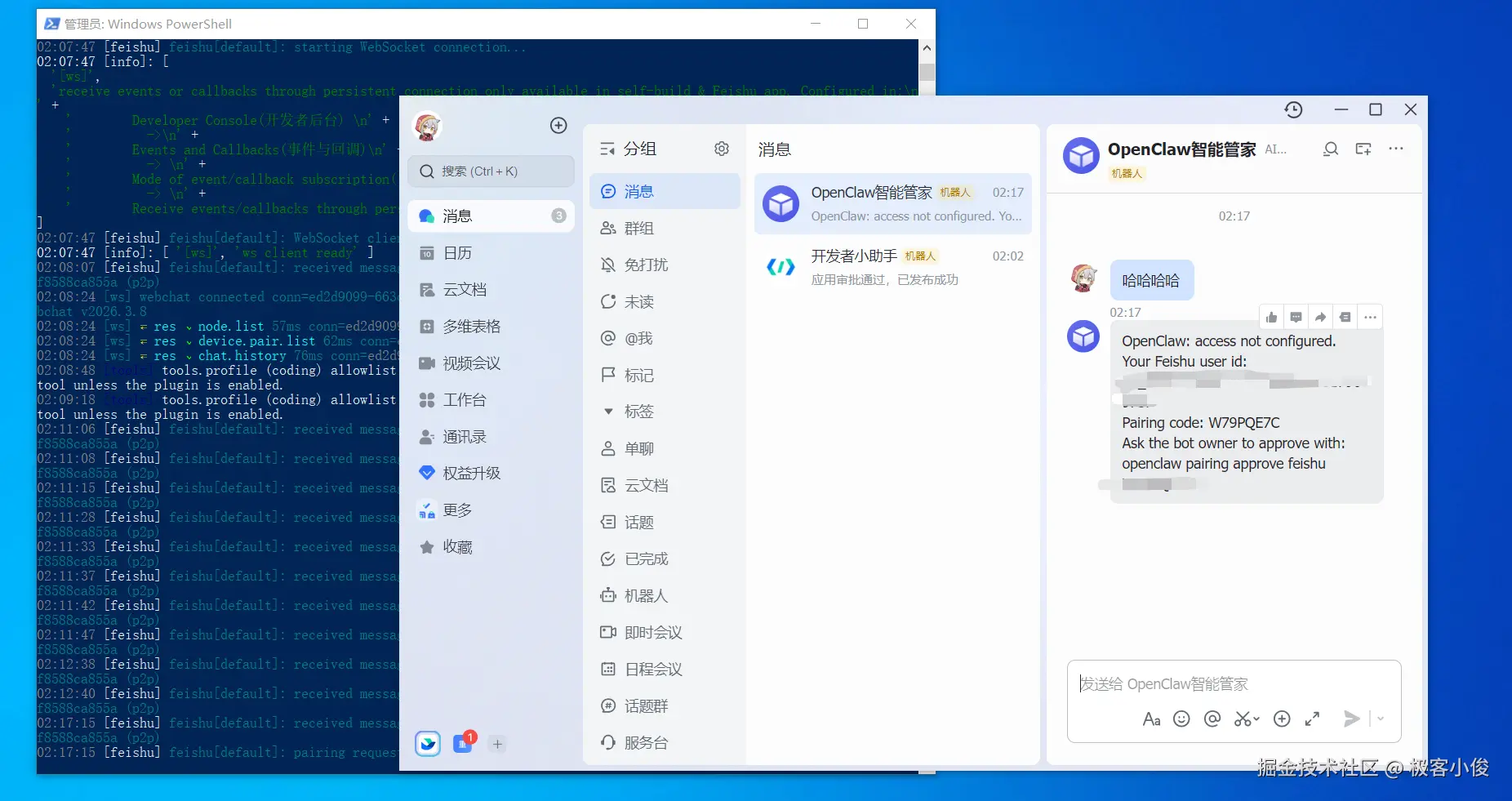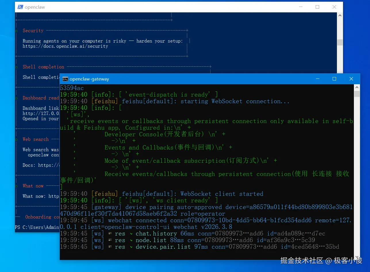 注意: 这个小黑屏窗口是 OpenClaw 的网关服务,必须保持打开才能让飞书机器人持续运行