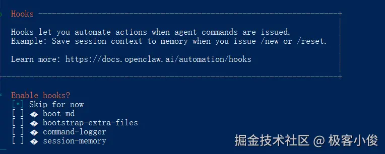 用方向键选中Skip for now,按回车确认,先跳过 Hooks 配置