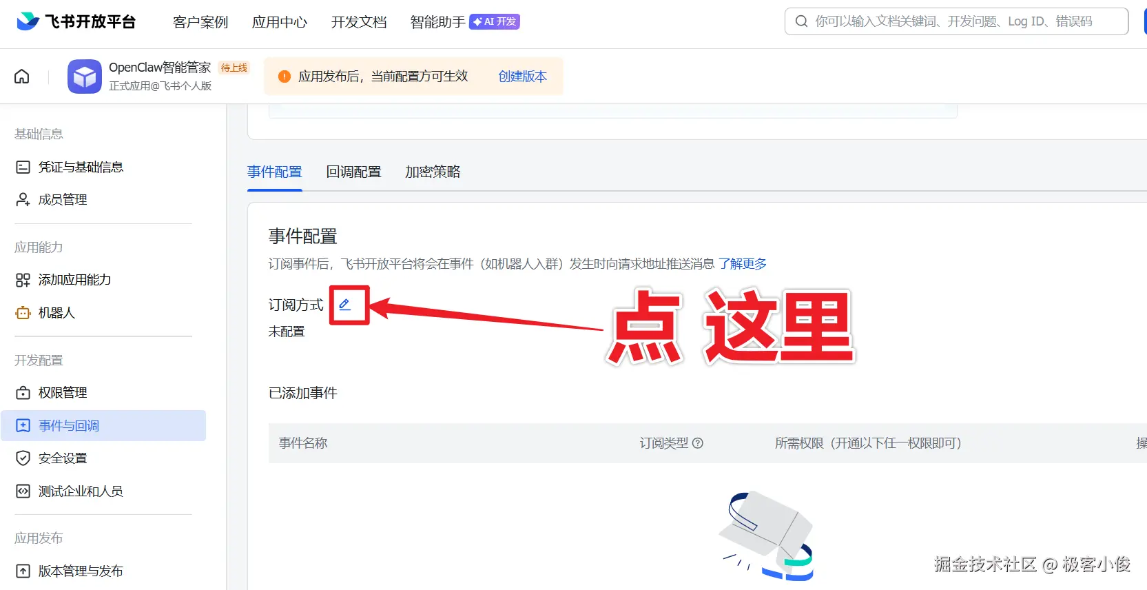左侧菜单点击事件与回调, 右侧点击订阅方式旁边的这个笔
