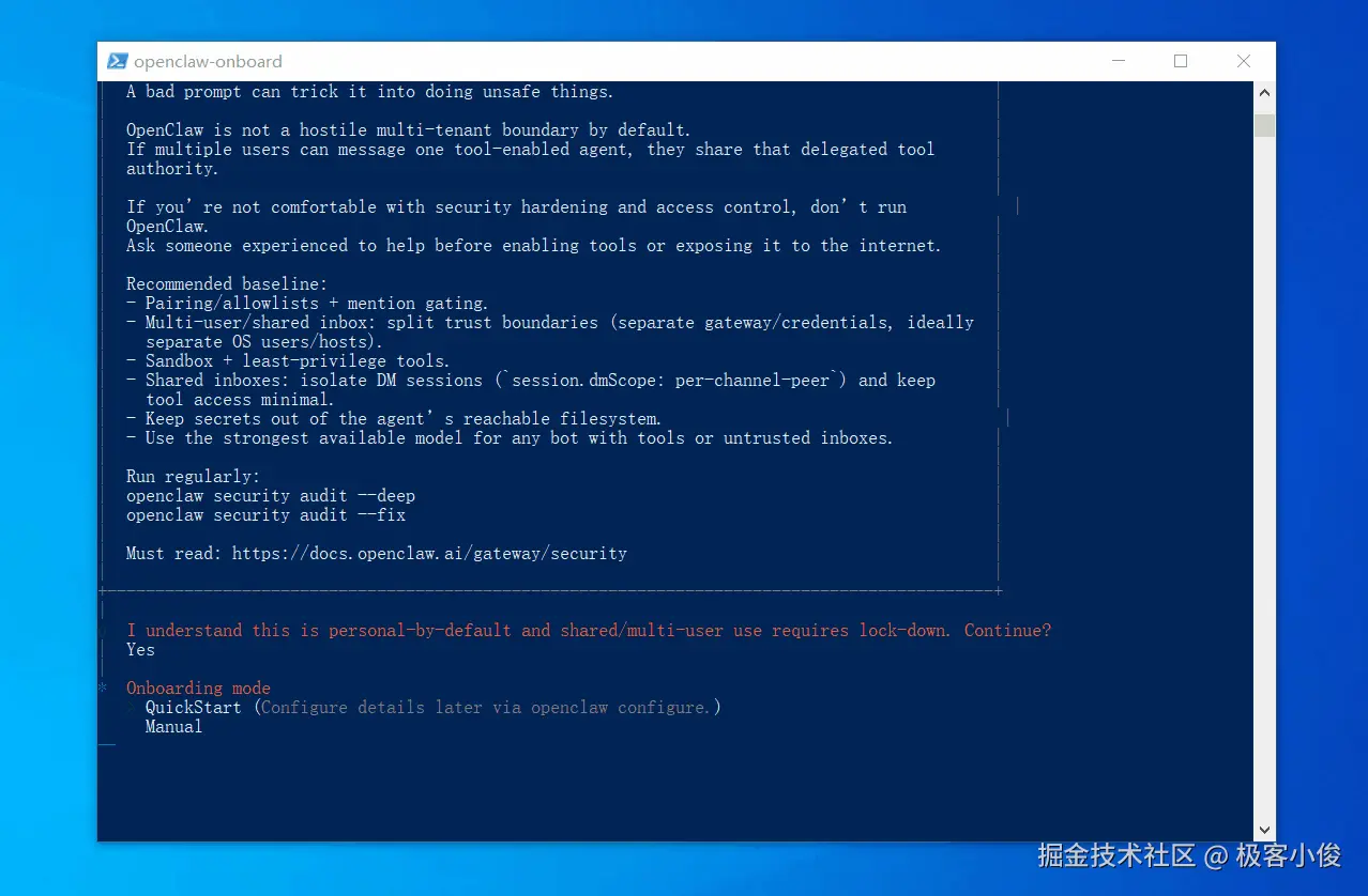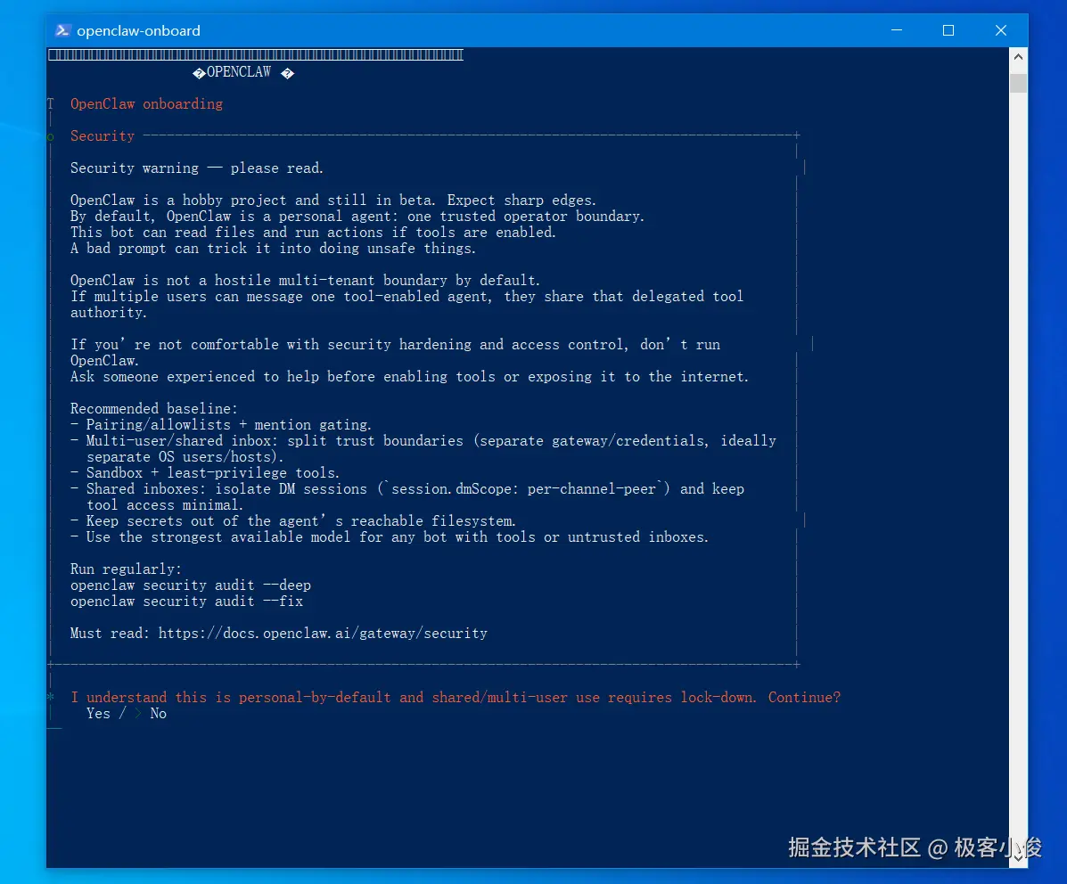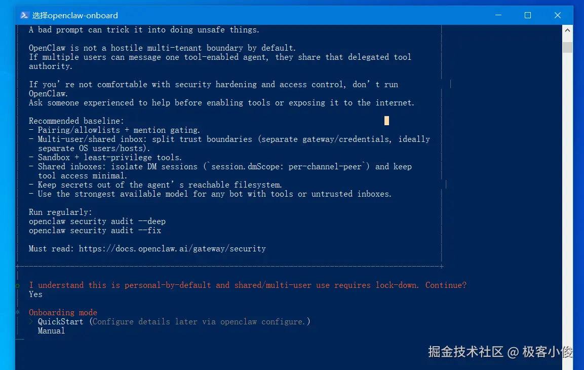 这一步是OpenClaw在跟你交底,它现在是个人用的 AI 助手,默认只信任你一个人,不会随便给别人权限