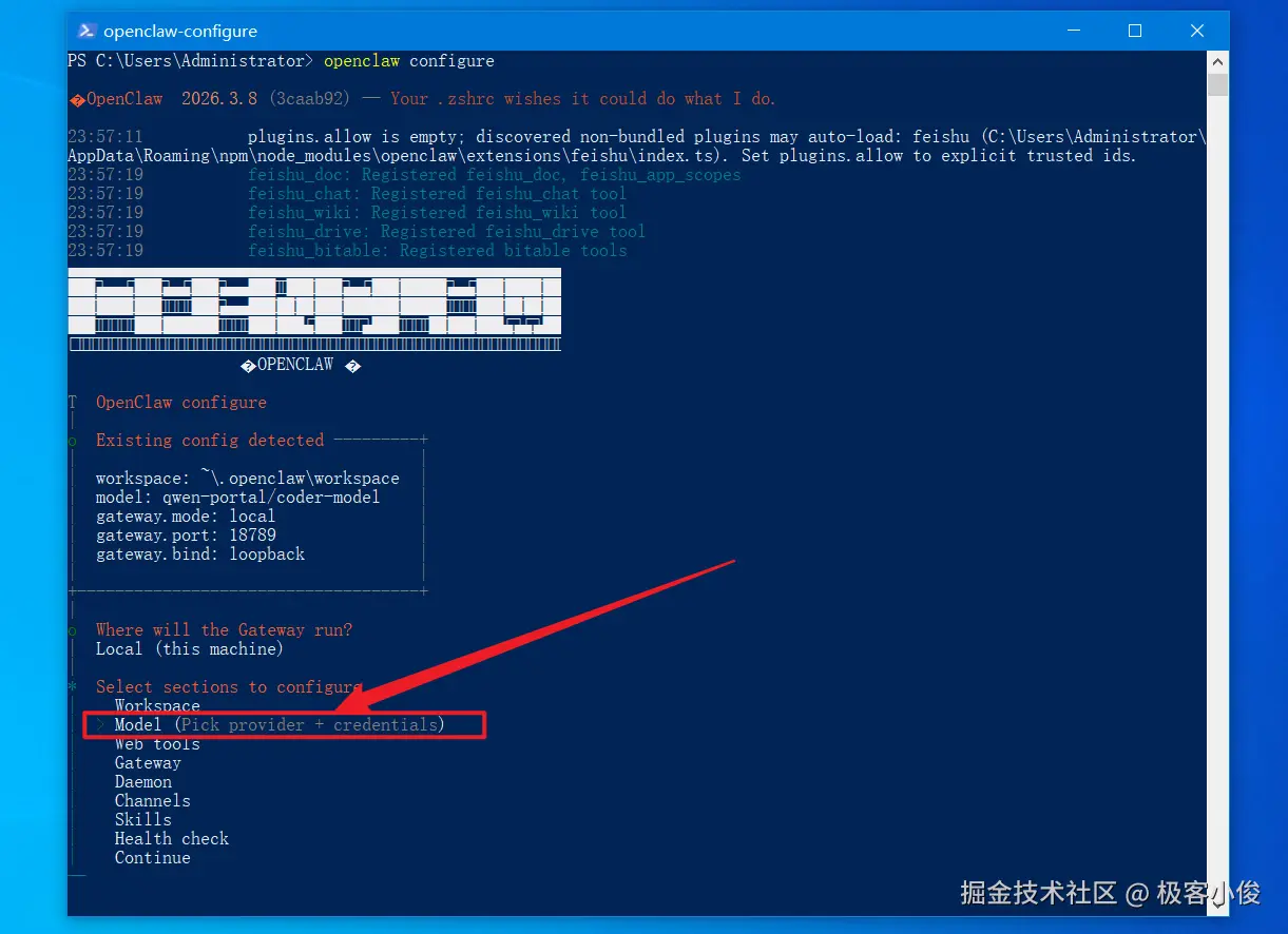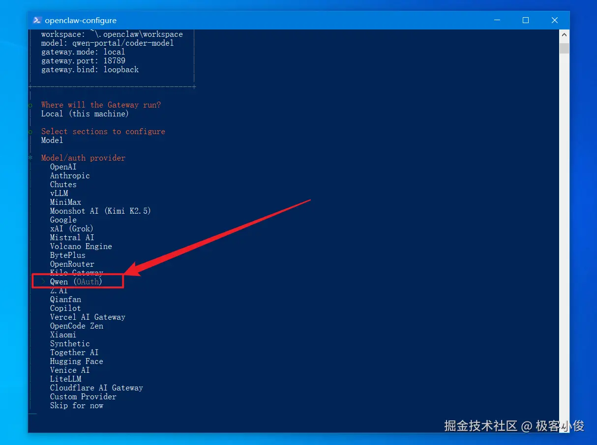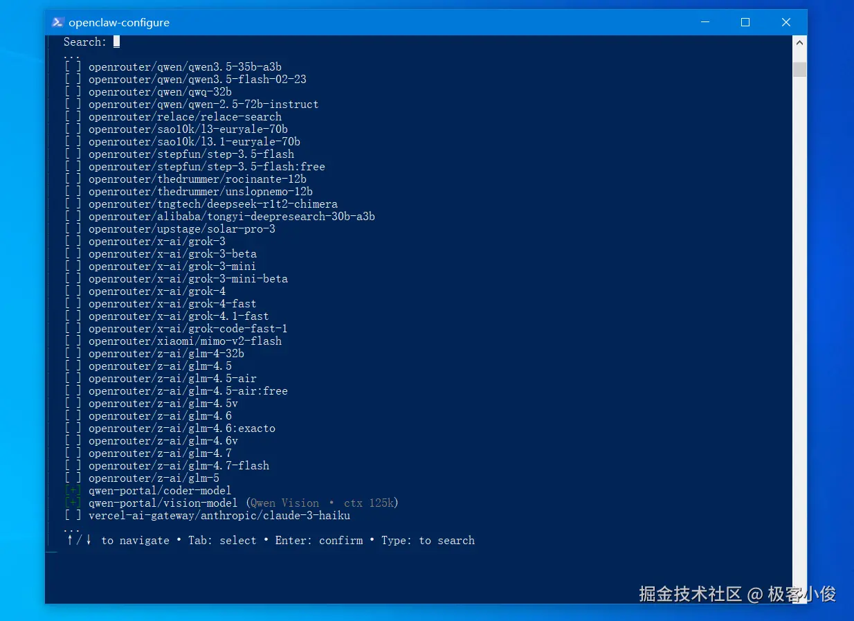 直接选 qwen-portal/coder-model,按空格勾选,回车确认!
