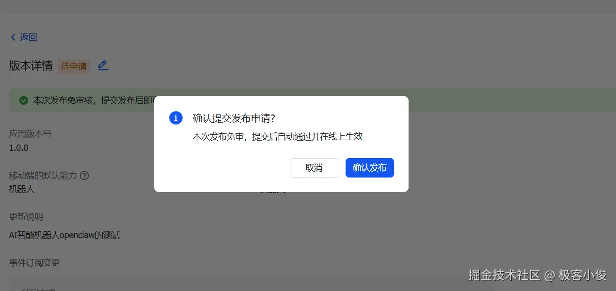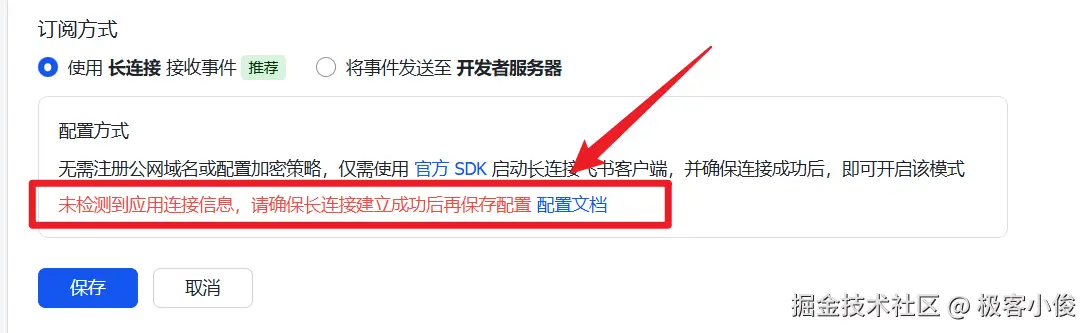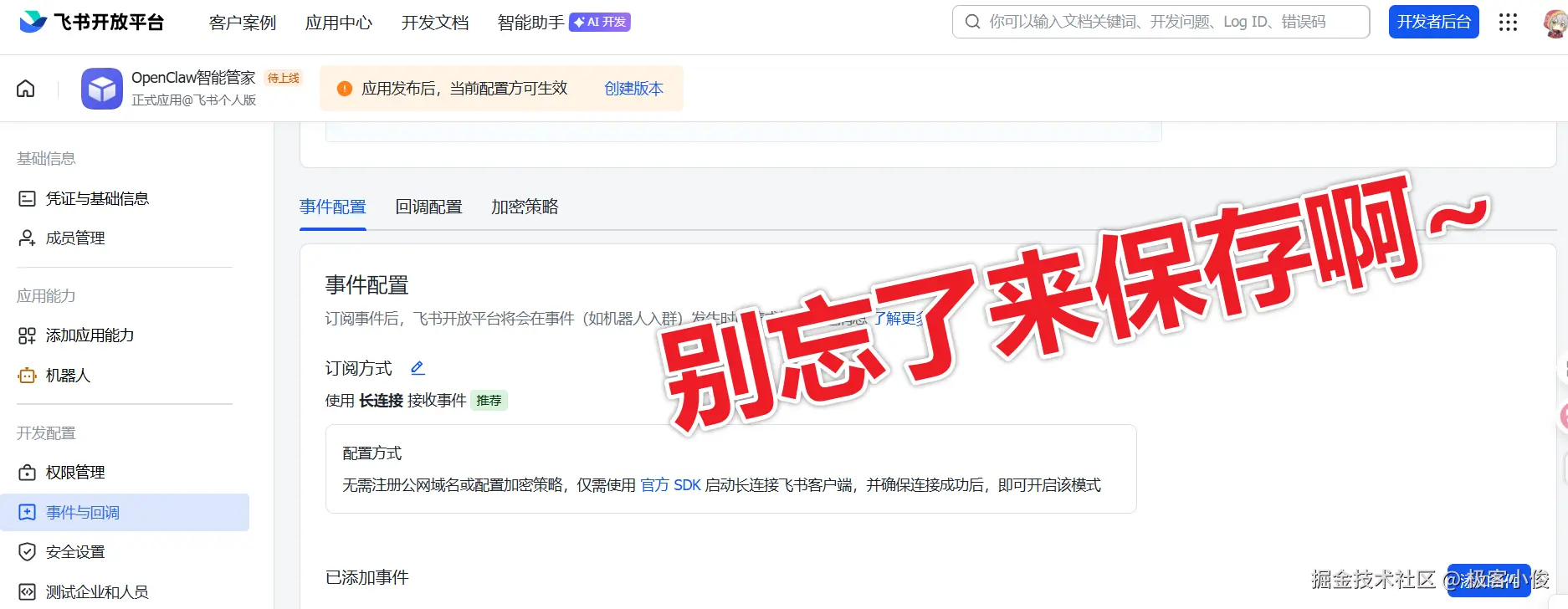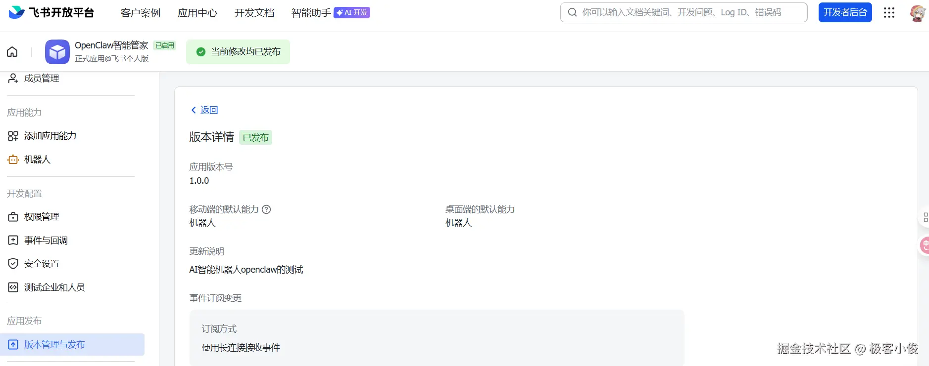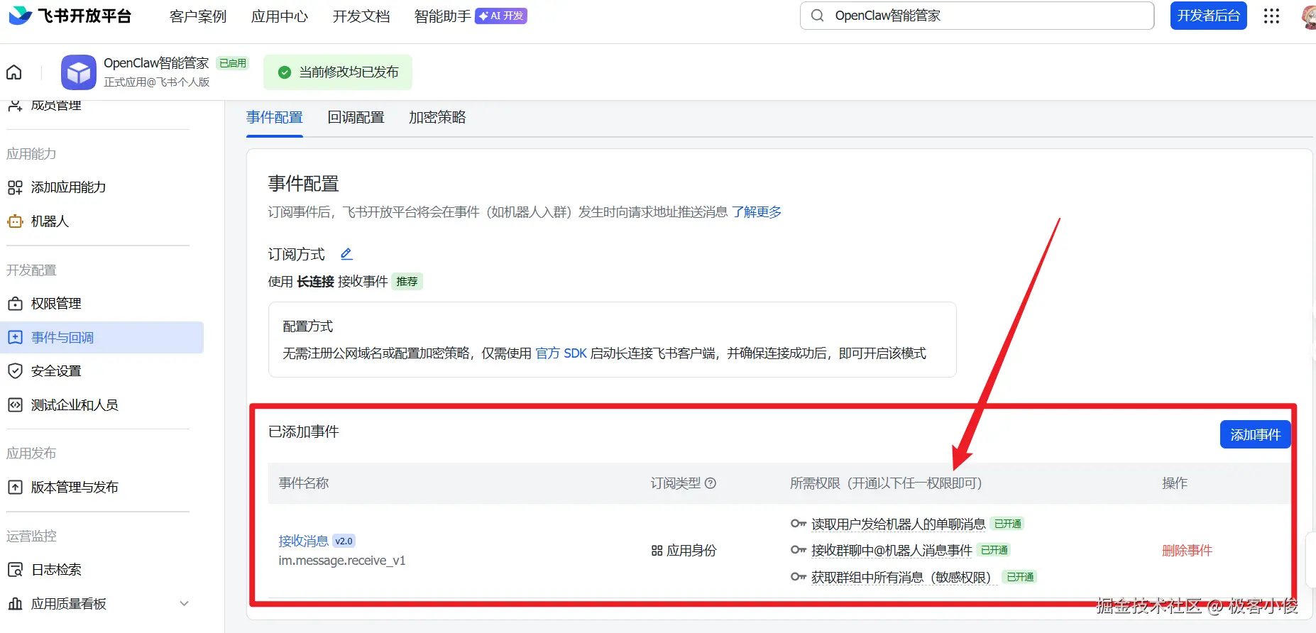 确认订阅了 im.message.receive_v1 事件,且订阅方式是「长连接」,不是「HTTPS 推送」,并且已经发布版本。