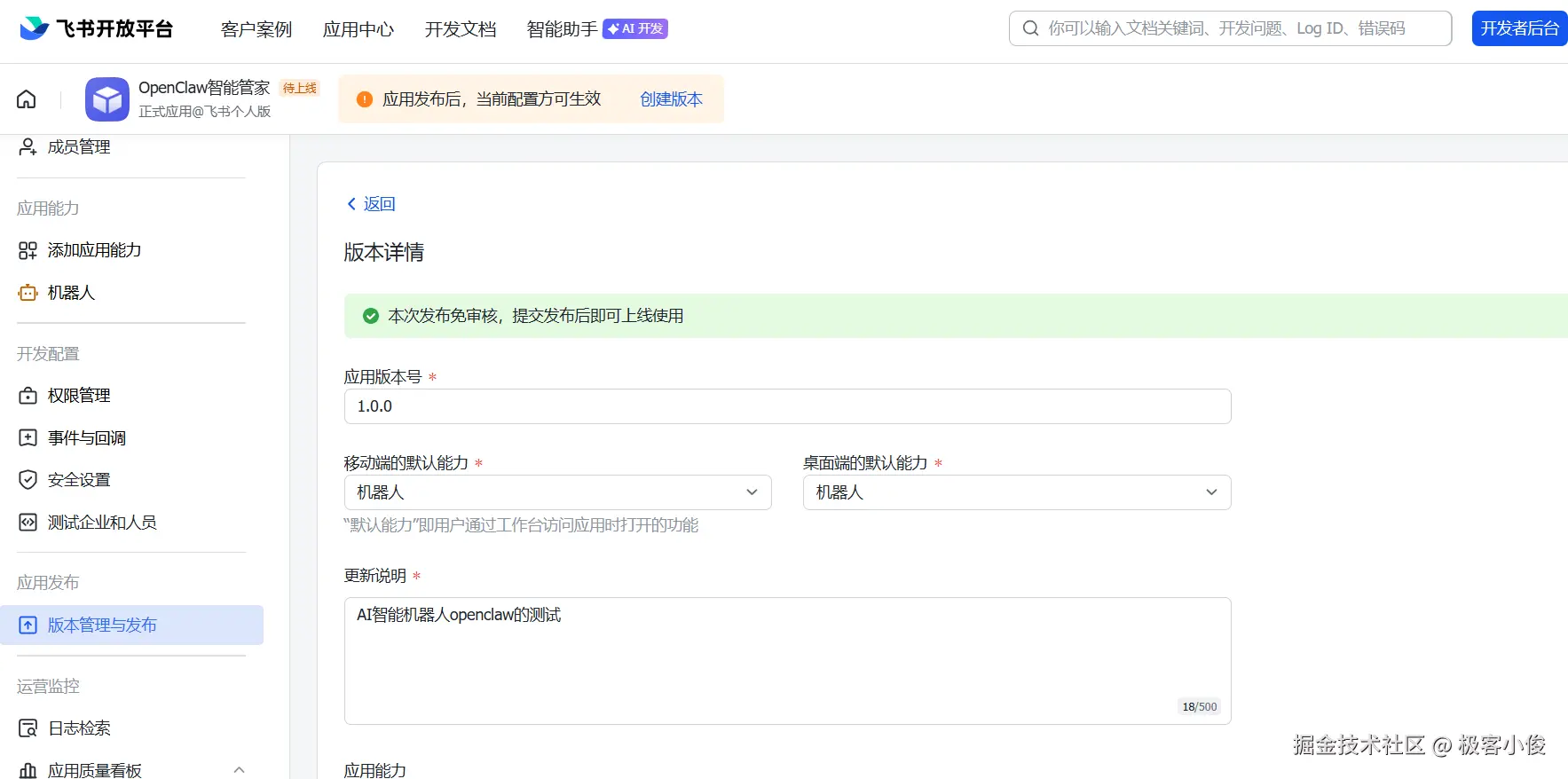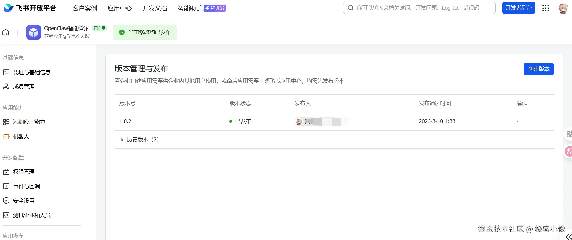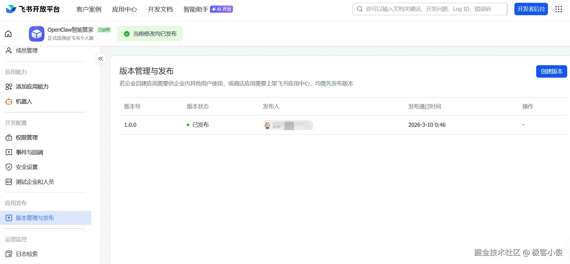 审核发布成功后,可以在版本管理与发布页面,查看到已经发布的版本号和状态