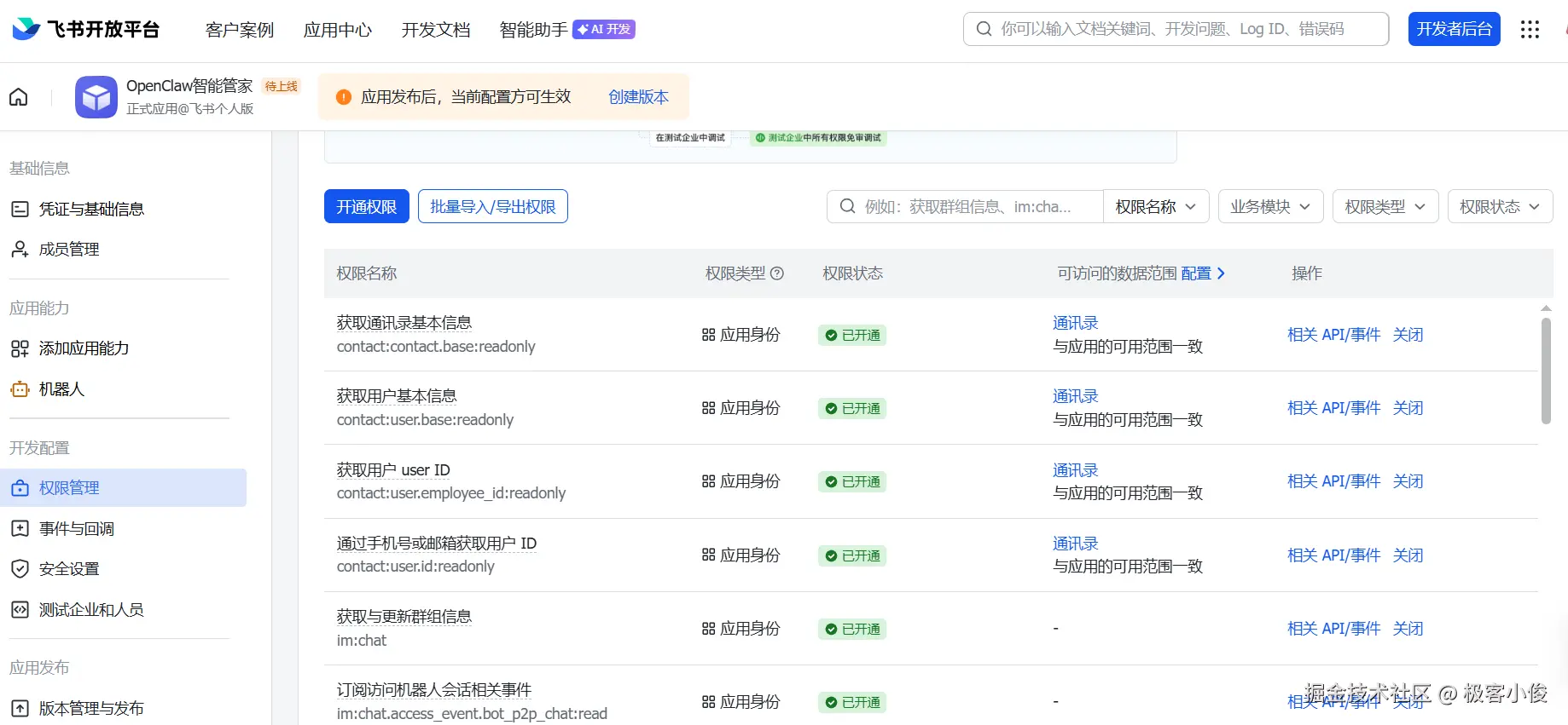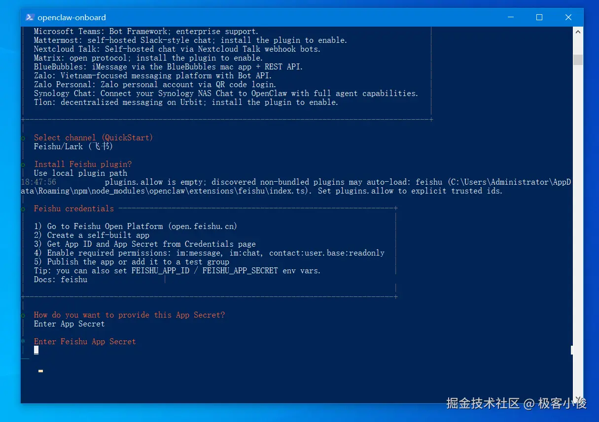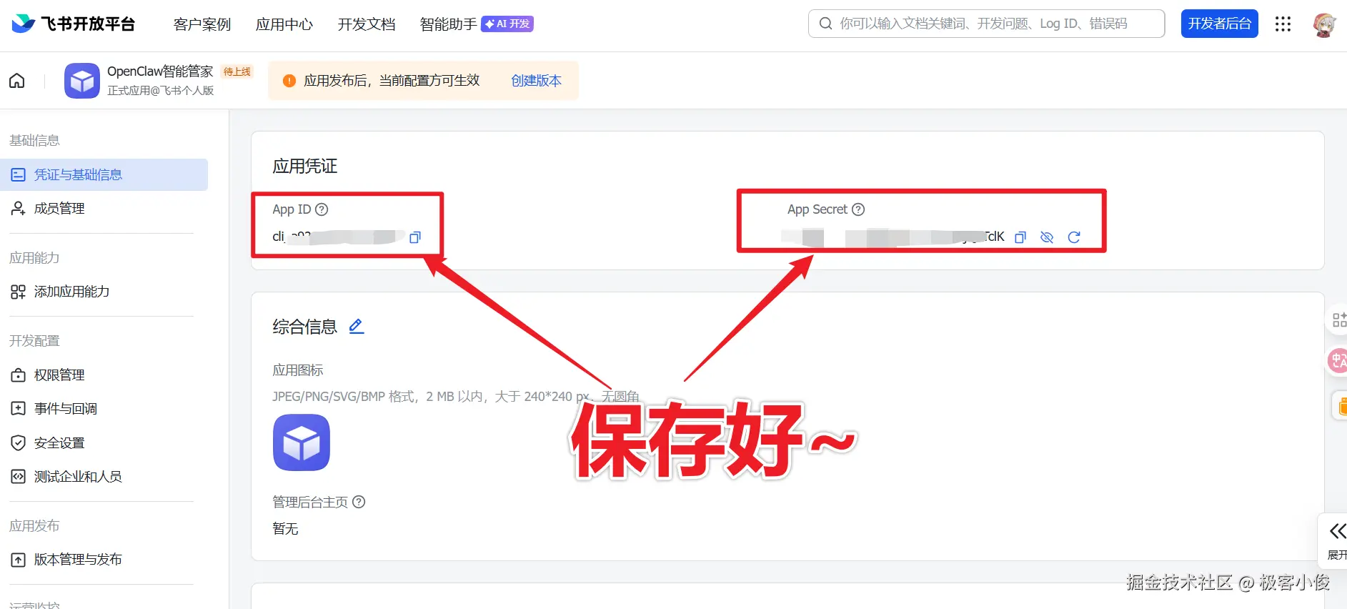 然后接下来这一步是让 OpenClaw 对接你的飞书账号,需要你先在飞书开放平台创建应用并获取凭证~