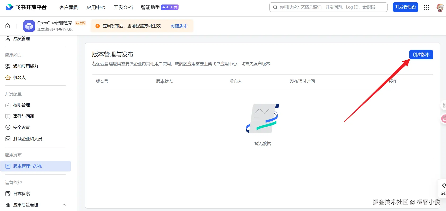 左侧导航栏找到版本管理与发布,点击进入, 继续点击右上角的创建版本