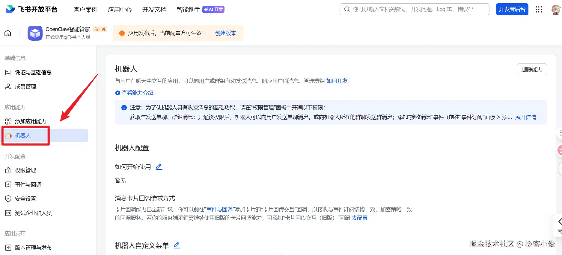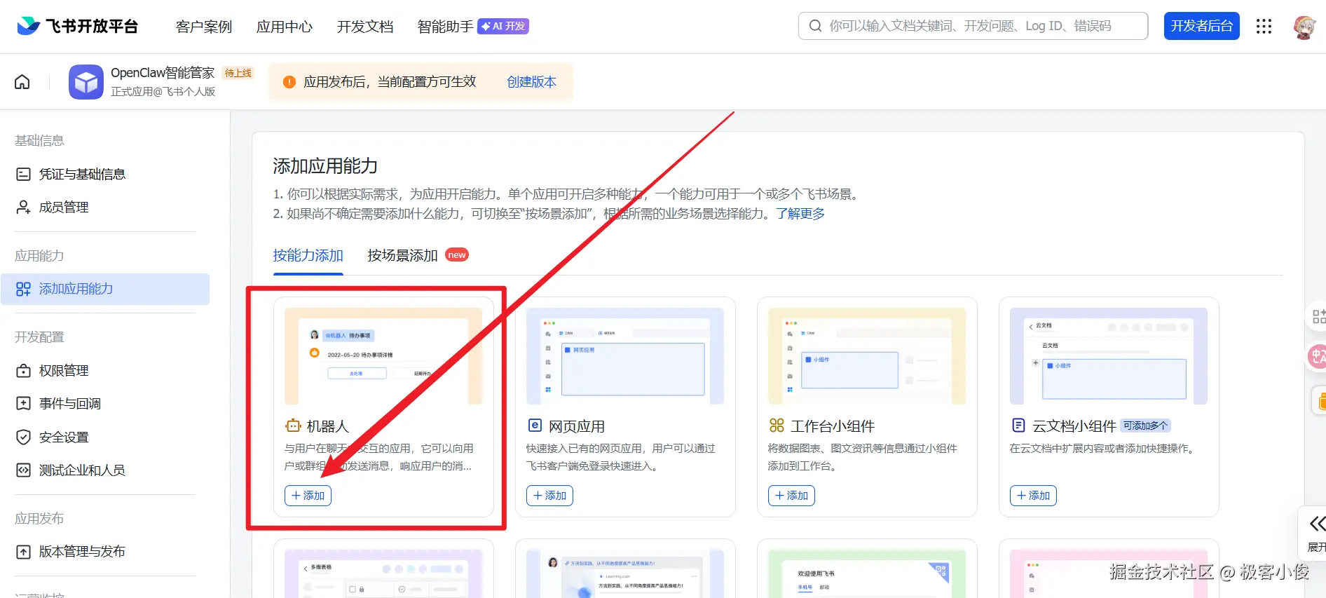 然后在:左侧菜单的 添加应用能力 → 选择 机器人 并添加开启