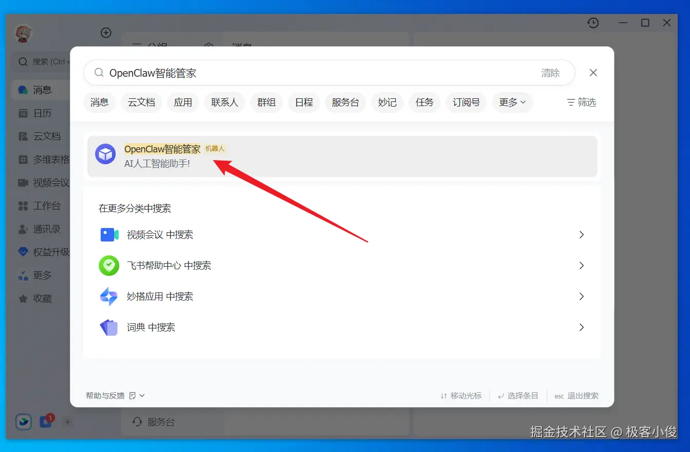 继续...在电脑端打开飞书, 搜索你的机器人名称~ 比如: 我这里叫 : OpenClaw智能管家
