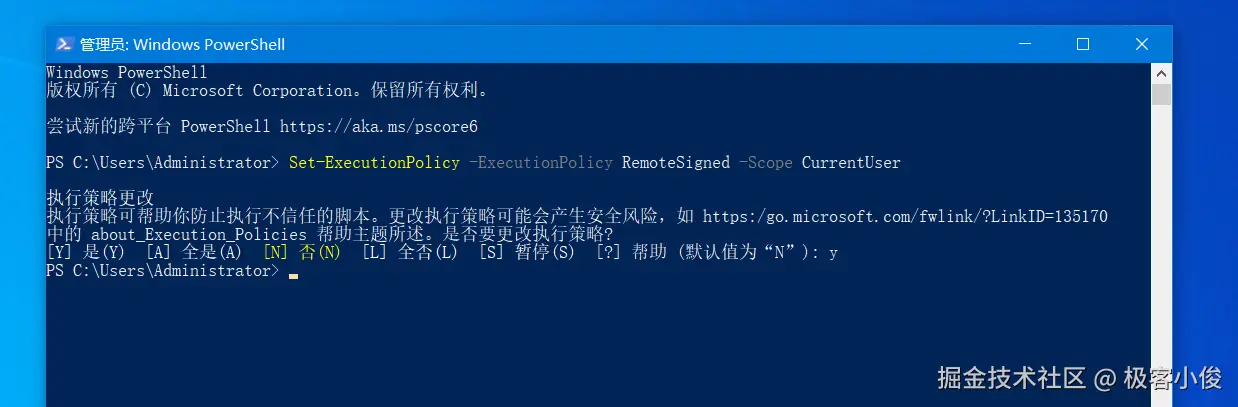 所以我们要在管理员身份的PowerShell中执行以下命令,临时放宽执行策略: