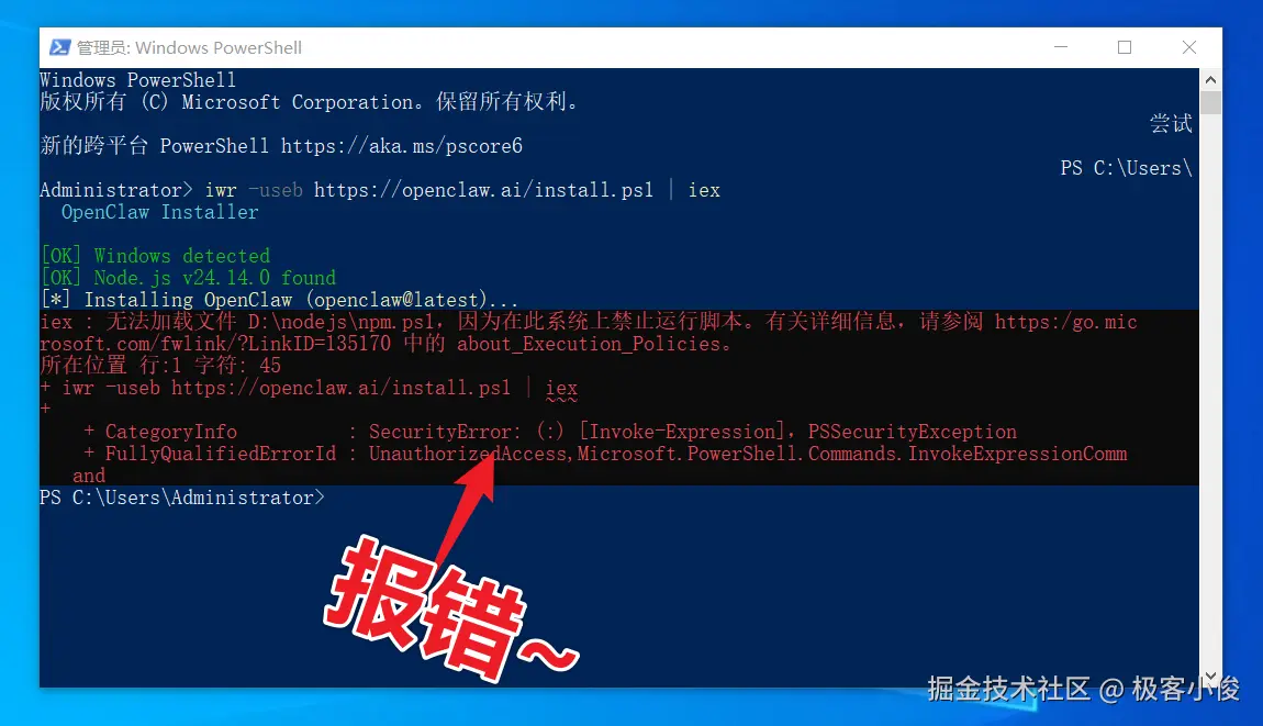 Windows PowerShell 的执行策略限制,默认不允许运行未签名的脚本,可能会导致 OpenClaw安装脚本无法执行。