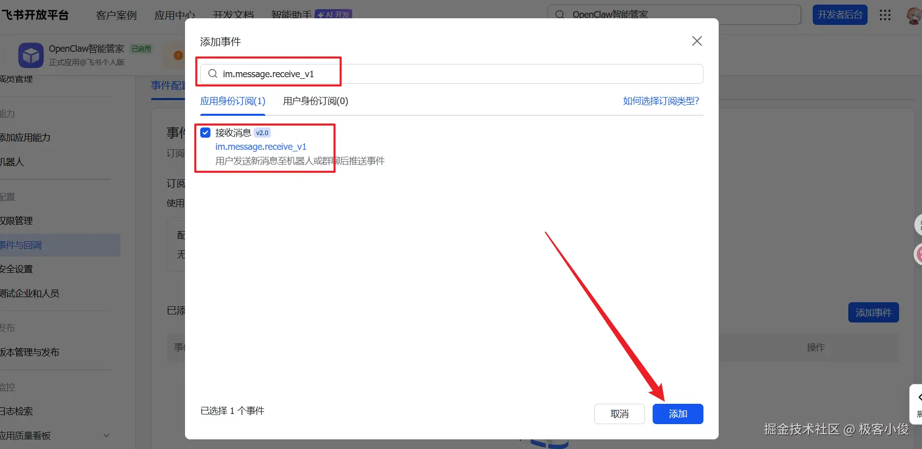 然后在搜索栏中 搜索关键字:im.message.receive_v1, 并且勾选接收消息, 点击`添加``