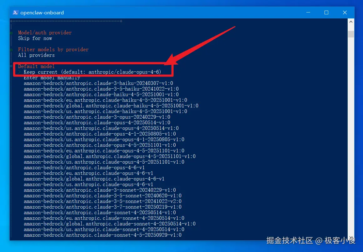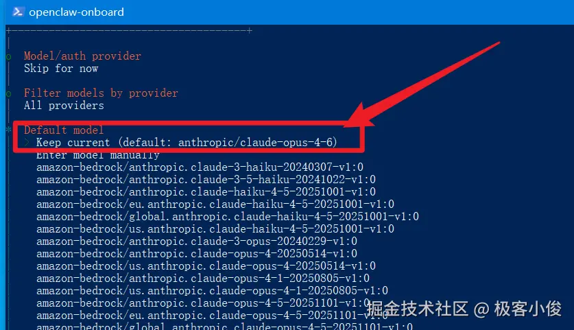 然后继续用方向键选中 Keep current (default: anthropic/claude-opus-4-6),然后按回车确认,直接用默认模型即可