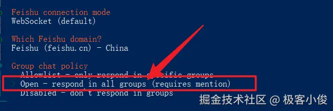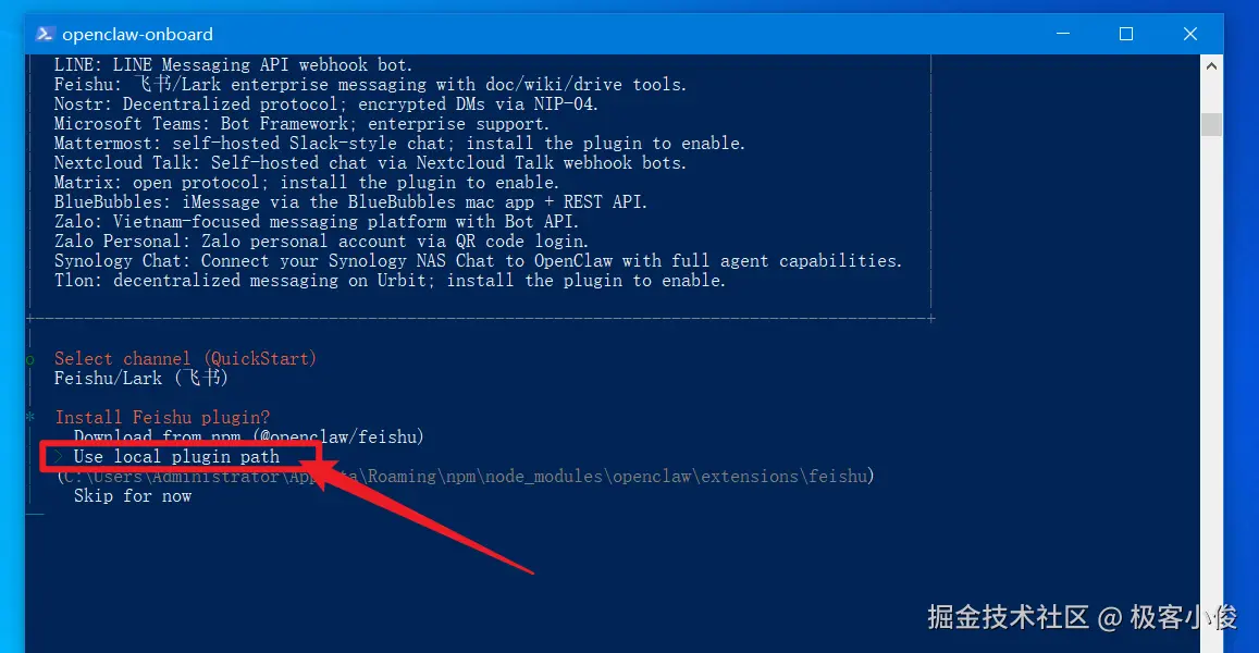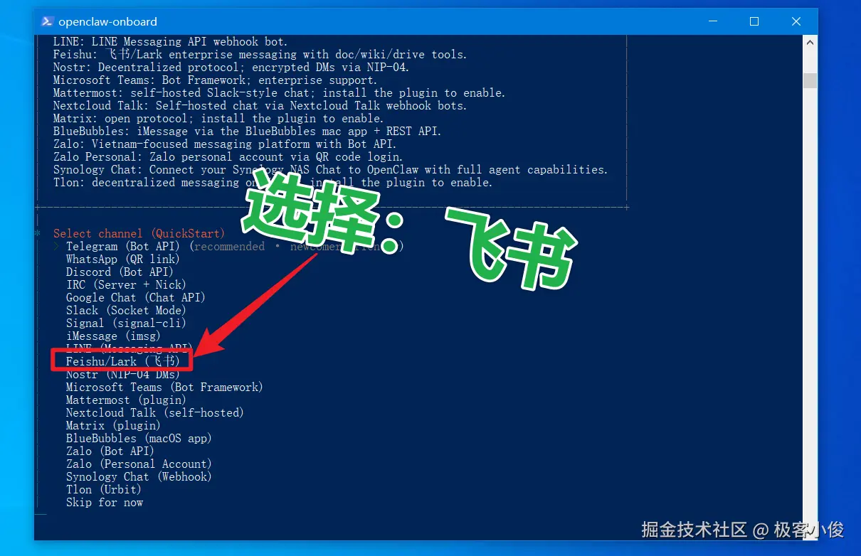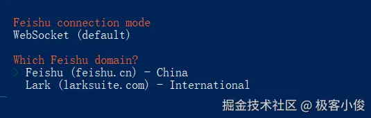 继续用方向键选中 Feishu/Lark(飞书)然后按回车确认,这是我们要对接的目标平台~