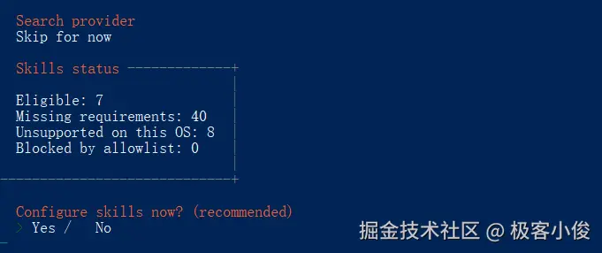 用方向键选中No,按回车跳过技能配置,先完成基础安装