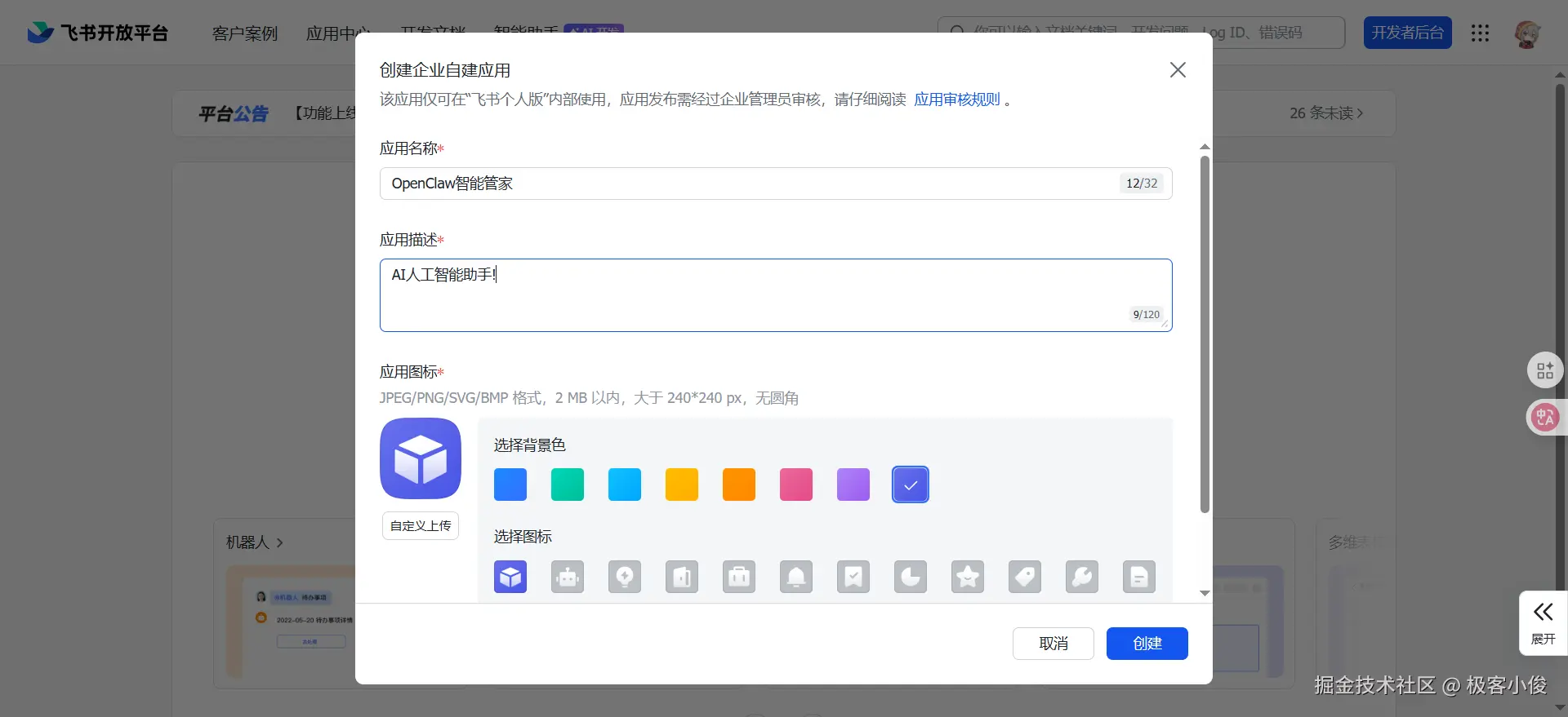 然后继续填写应用名称, 比如 OpenClaw智能管家 和描述,点击"确定创建