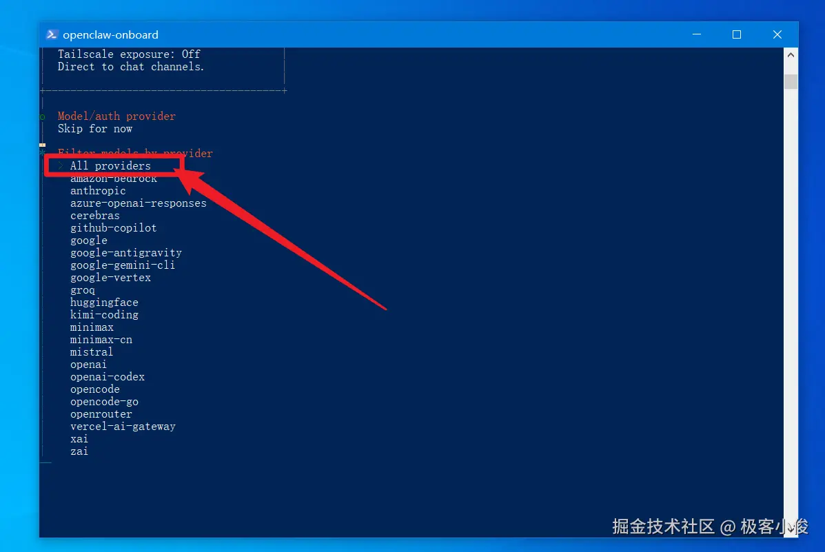 这一步是筛选模型来源, 我们选All providers会显示所有可用模型,避免漏掉你后续要配置的目标选项~