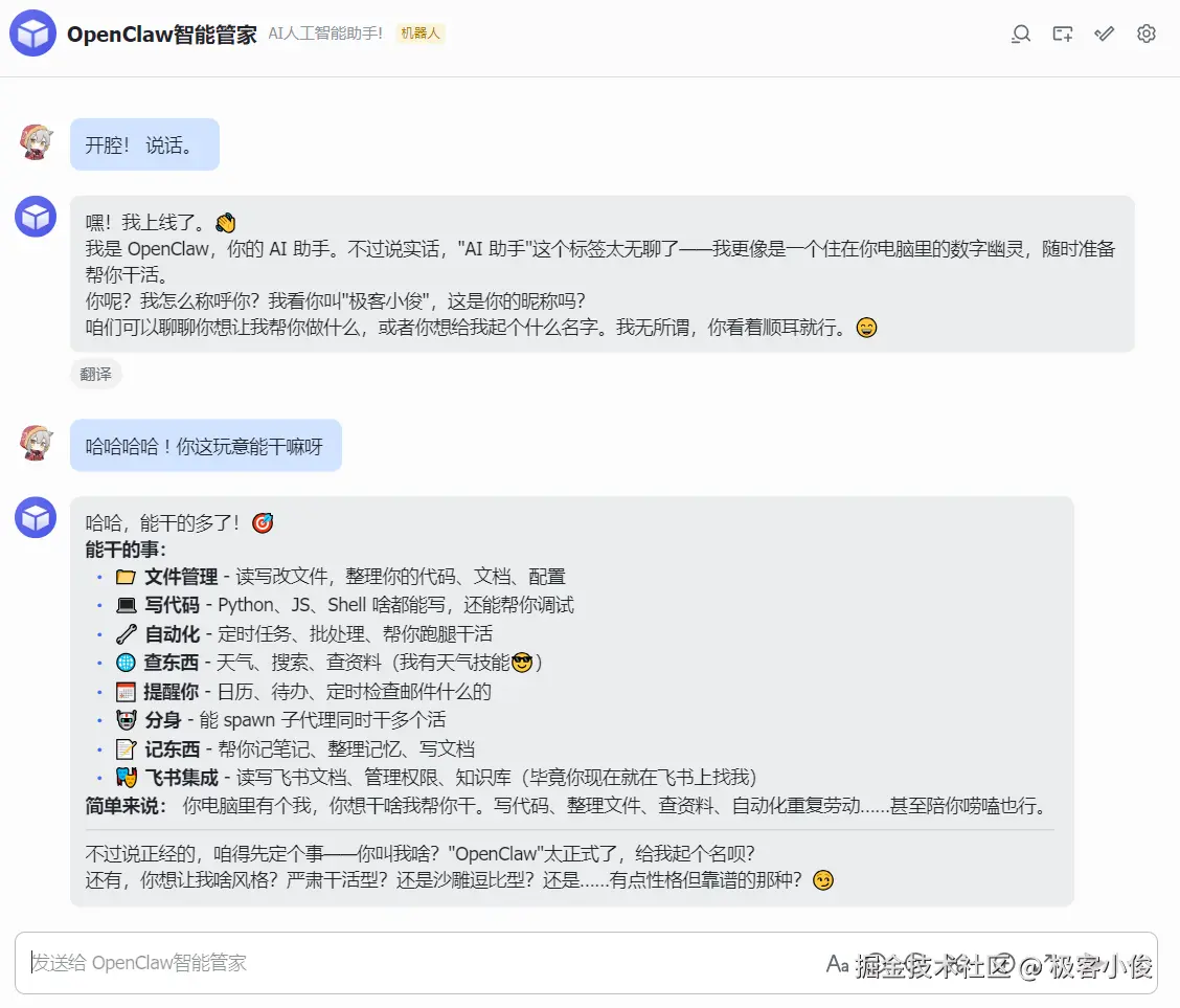 到此我们的OpenClaw已成功部署并完成飞书集成,能正常接收指令并执行操作,安装运行成功!