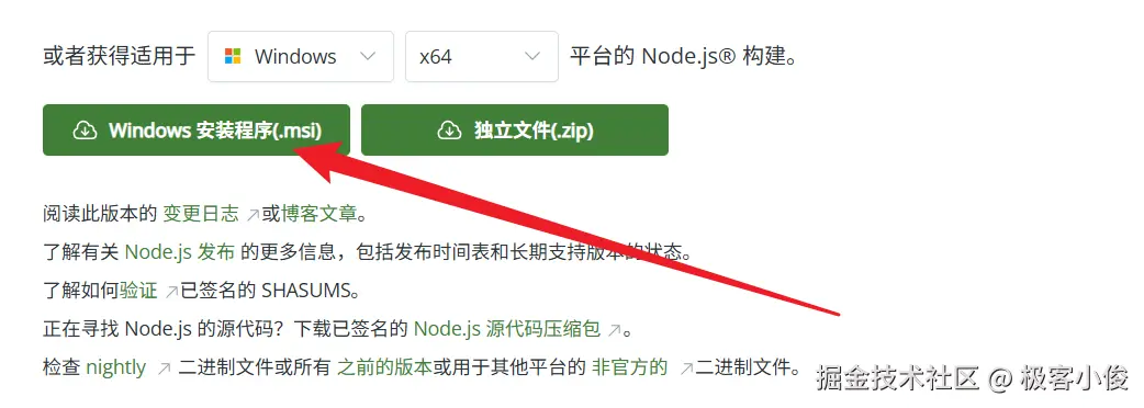 这里我们直接点击绿色的Windows 安装程序 (.msi),这是最省事的方式,无需 Docker