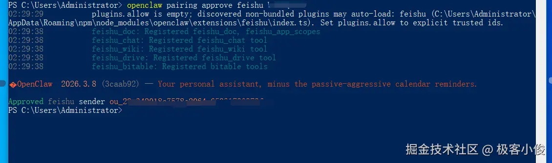 ✅ 配对成功了!我们的飞书账号已经被 OpenClaw 网关批准了