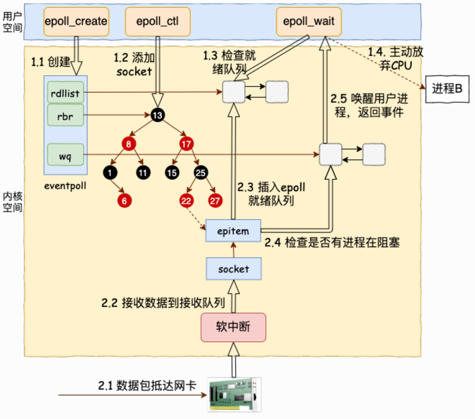 epoll 在内核中维护了 3 个核心数据结构,这是它高效的本质: