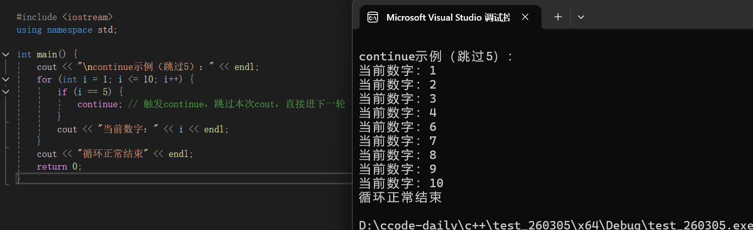 cout << "\ncontinue示例(跳过5):" << endl;