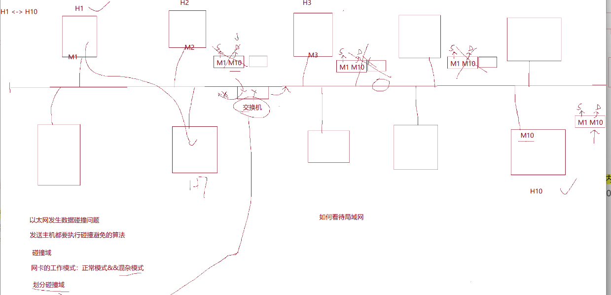 局域网,多台主机共同向其中发数据,主机H1发送数据会被其他所有主机接收,数据内容包含M1发出M10接收(假如),H2主机接收后发现自己是M2,不是M10,直接丢弃,就不再向上层传输,主机H10接收发现自己就是M10,向上层传输