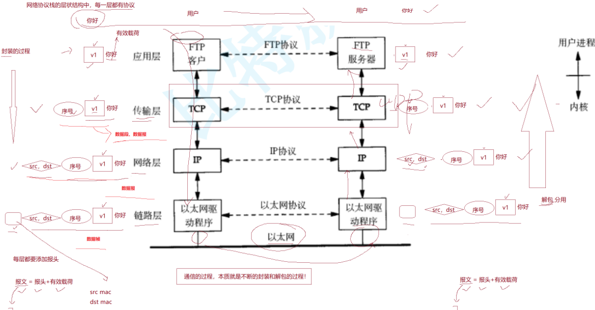 用户层拿到了有效载荷,会添加报头再传给传输层,传输层会再添加报头传给网络层,网络层再添加报头传给数据链路层,通过物理层将数据传到另一台主机后,数据链路层会解包属于自己的报头,向上传输,网络层解包自己的报头,传输层解包自己的报头,应用层解包自己的报头,最后拿到数据