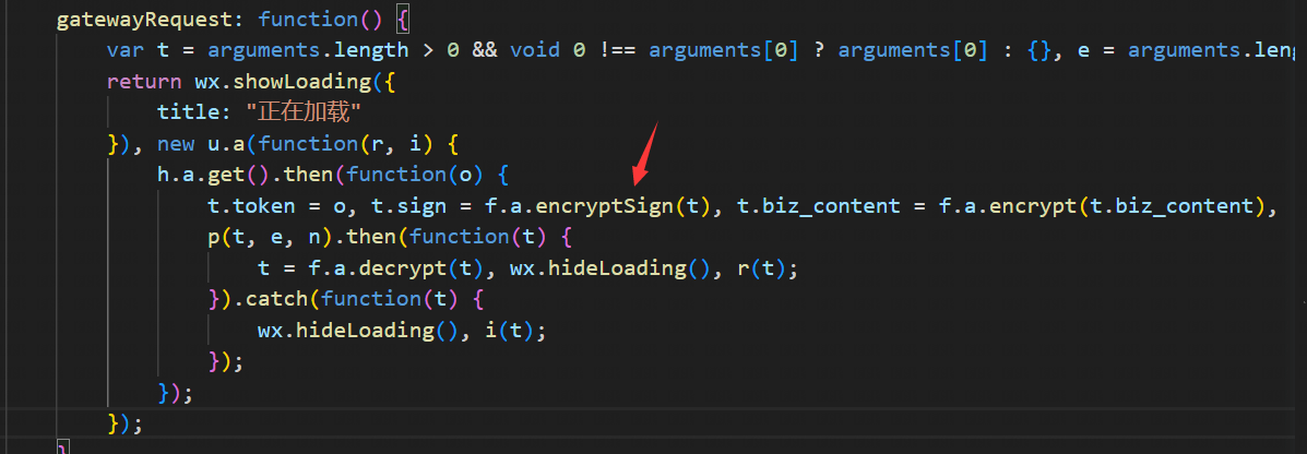 回溯源码看哪里调用了encryptSign,搜索encryptSign查到gatewayRequest函数。继续跟进。