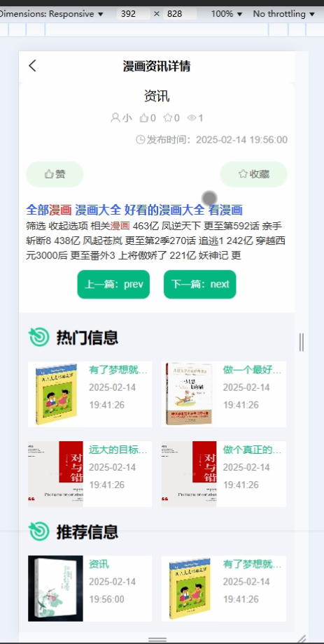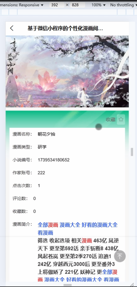 - 前端架构:以微信小程序为载体,采用 WXML、WXSS、JavaScript 及 Vue.js 技术,负责用户交互与界面展示,核心实现首页推荐、漫画阅读、资讯浏览、个人中心等功能,遵循微信设计规范,确保交互流畅。