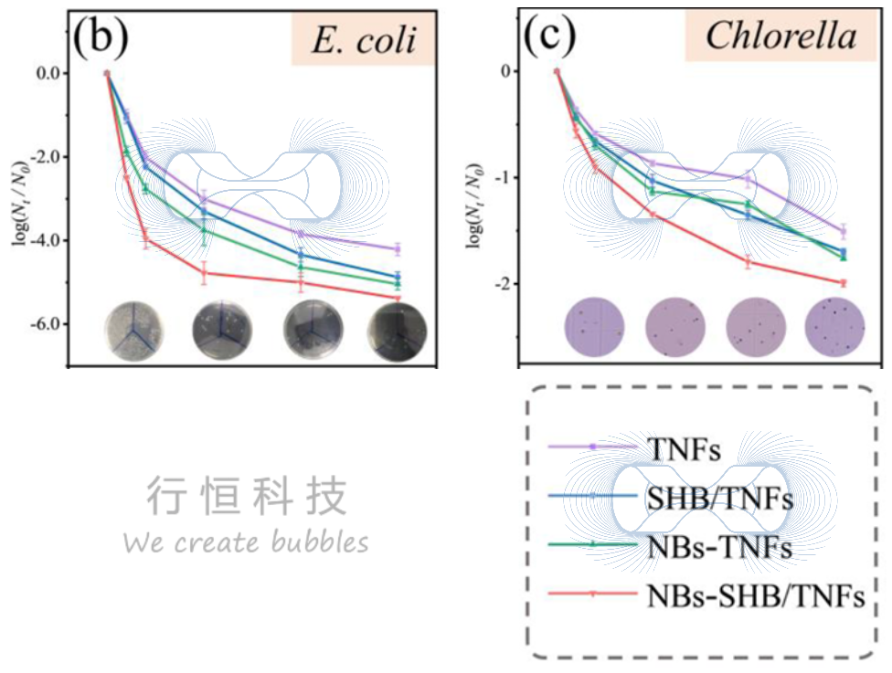 本研究旨在解决水下接触表面易受有机物和生物膜污染的难题。采用行恒科技的LF-1500微纳米气泡发生器, 研究创新性地构建了一个由底层固定化TiO₂纳米花阵列与上层超疏水涂层组成的双层系统,并辅以纳米气泡辅助 。该系统通过利用纳米气泡与超疏水表面之间的长程疏水力,捕获并富集大量氧气于界面处,从而极大地增强了底层TNFs在光照下的光催化降解效率。