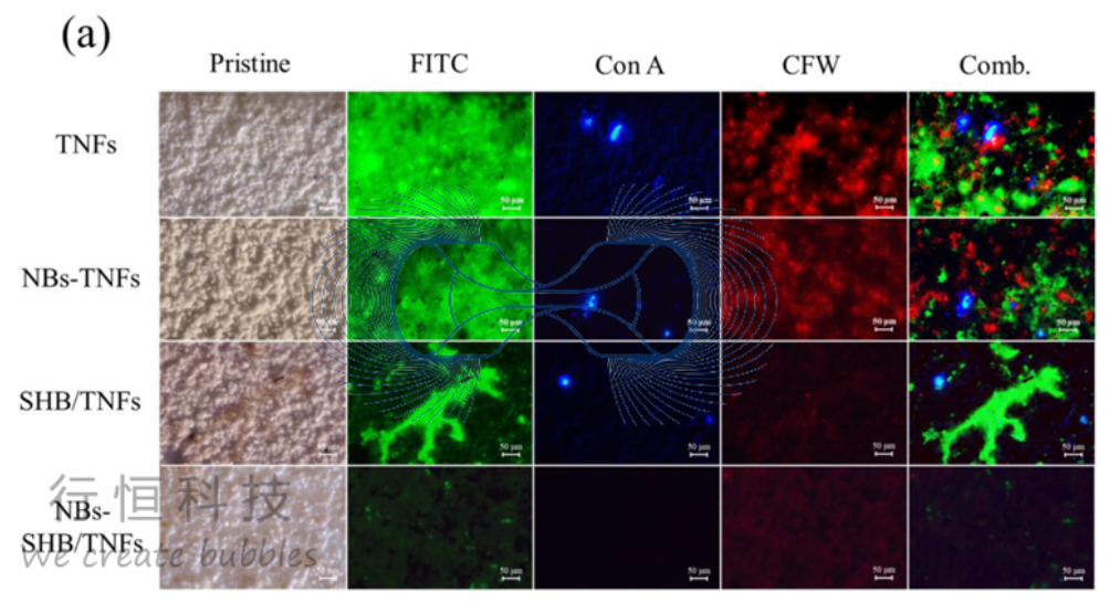 - 荧光显微观察:NBs-SHB/TNFs表面仅显示极微弱的生物膜荧光信号,而其他对照组表面则显示出明显的蛋白质和多糖聚集:
