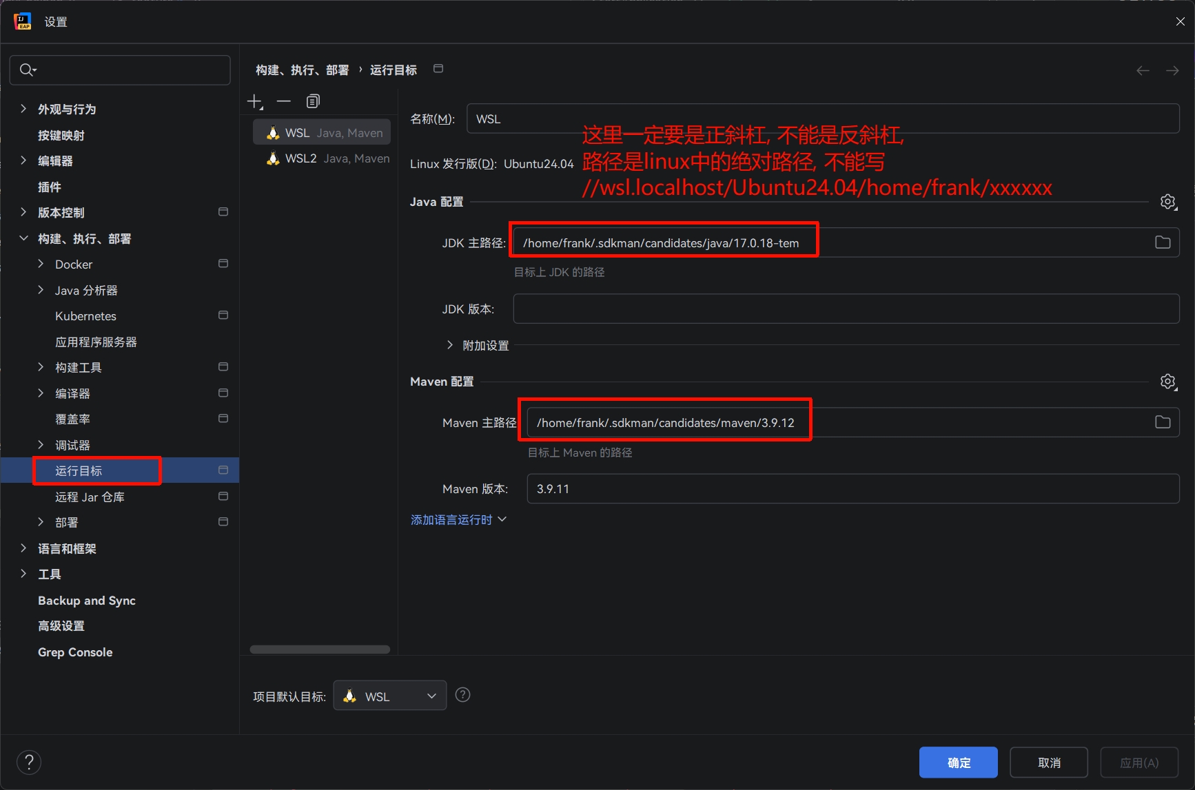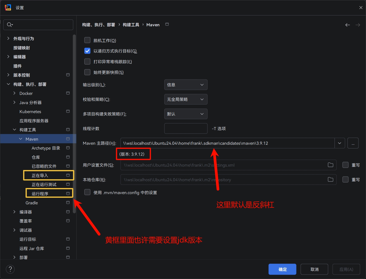 maven选择wsl中的, 注意版本显示要为红框的样式, 如果显示路径, 就是没找到maven