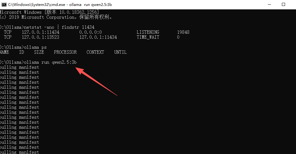 - 下载完成后执行命令ollama run qwen2.5:3b运行安装的大模型实例
