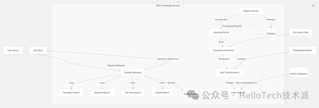 RAG(检索增强生成)知识系统负责处理文档、创建嵌入、将其存储在向量数据库中,并检索相关信息以进行 LLM 上下文增强。