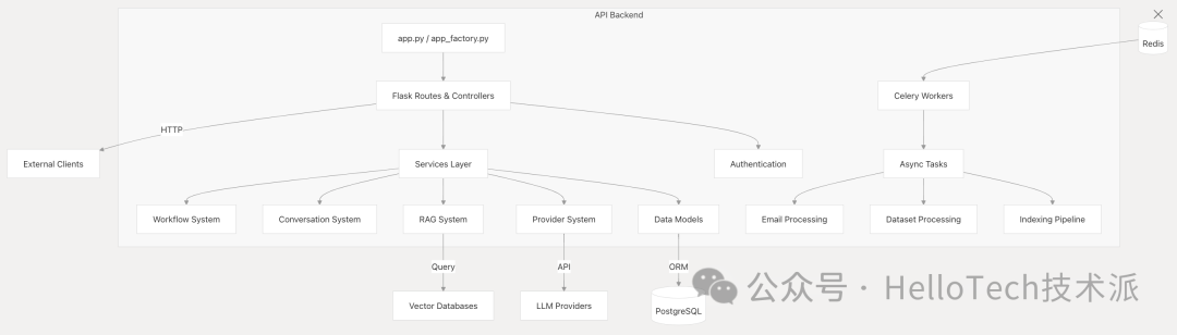 Dify 采用基于微服务的架构,将前端 Web 应用程序与后端 API 服务分离。该系统旨在实现可扩展性,并可在各种环境中部署,包括自托管安装和云部署。