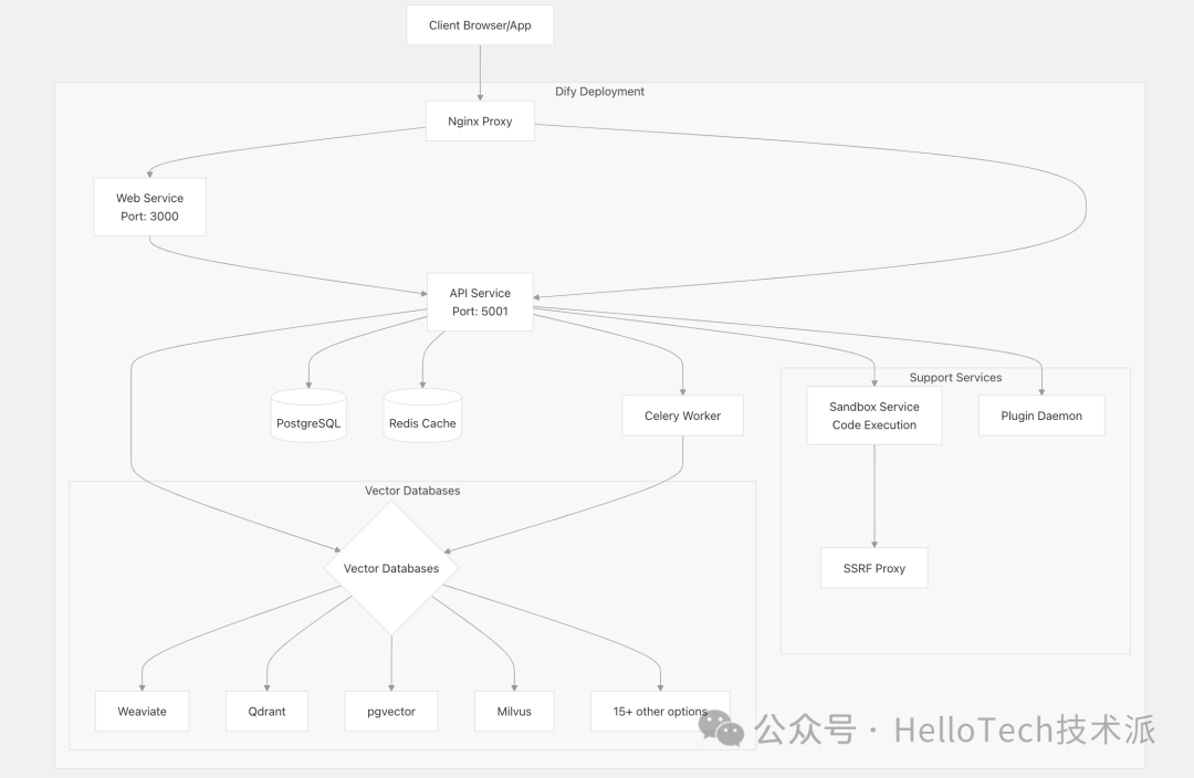 Dify 使用 Docker 进行容器化部署,方便在各种环境中部署。系统由多个可独立扩展的服务组成。
