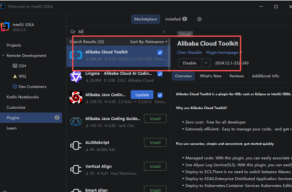 IDEA 中插件中搜索 Alibaba cloud toolkit,,找到后进行安装