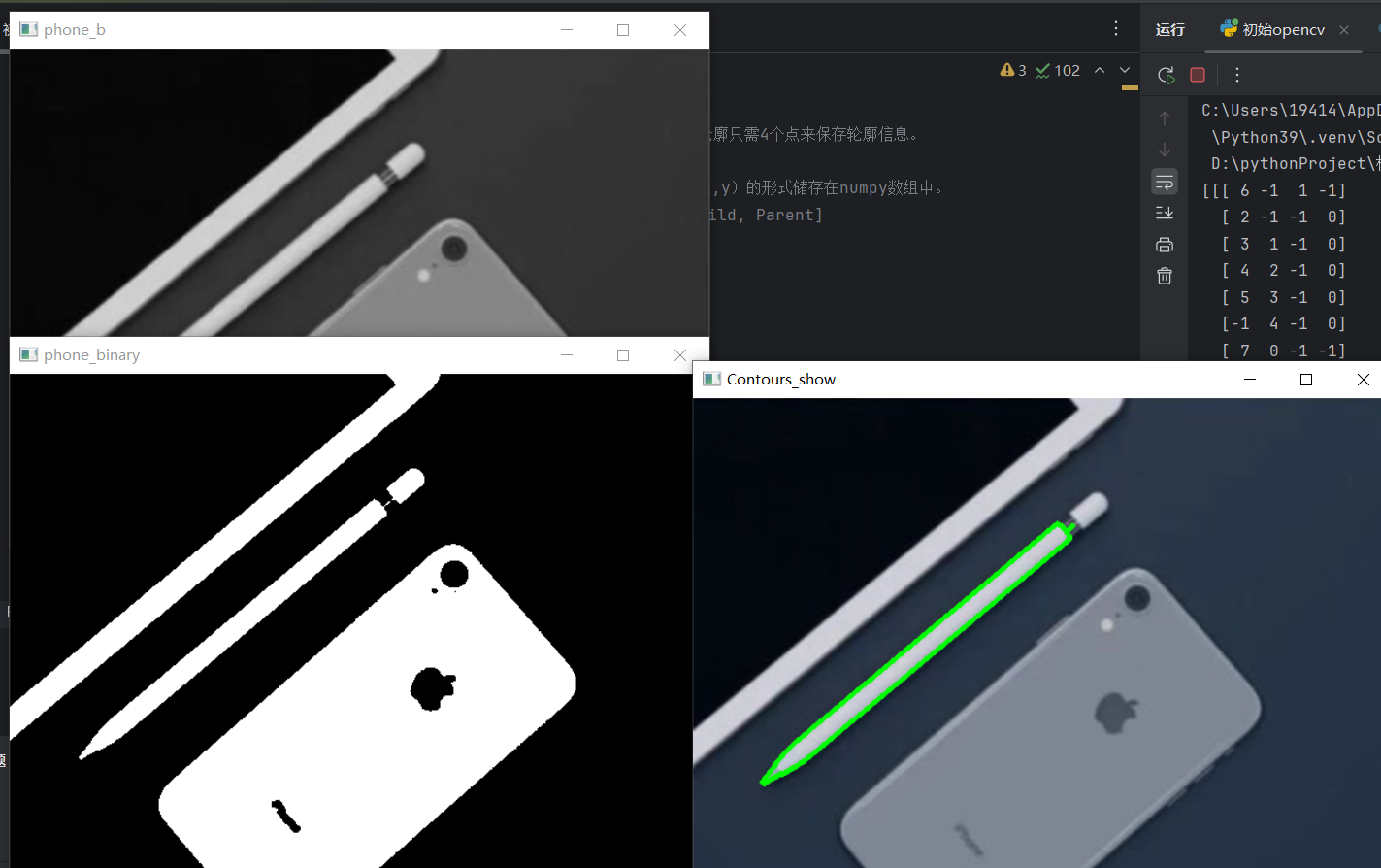 contours, hierarchy = cv2.findContours(phone_binary, cv2.RETR_TREE, cv2.CHAIN_APPROX_NONE)