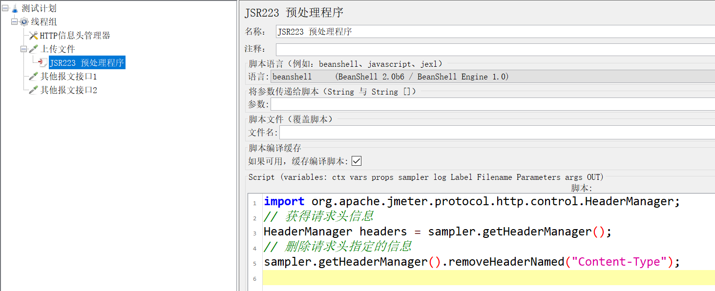 这时候需要用beanshell去掉默认请求头,还是用JSR223 预处理程序,语言选择beanshell